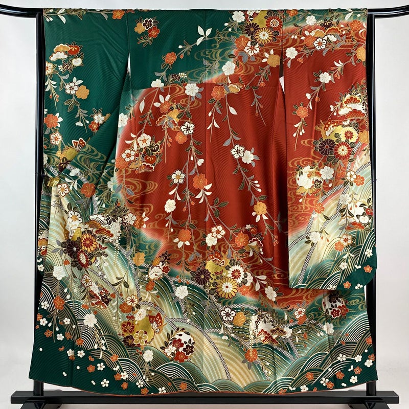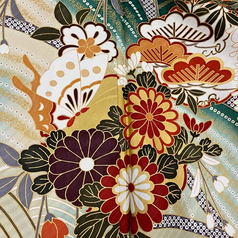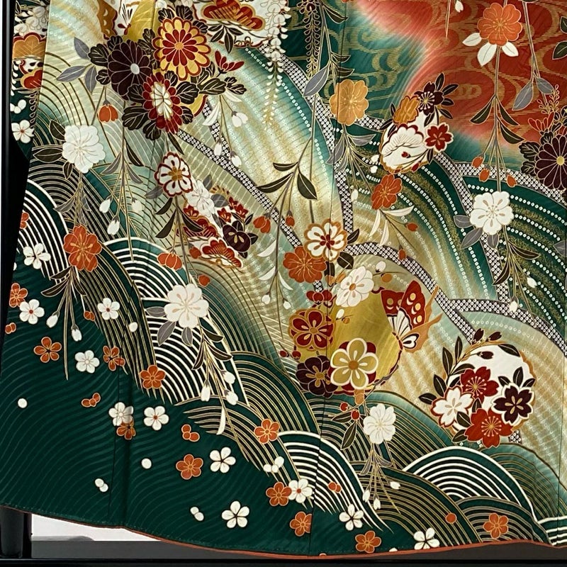 【振袖】 緑系 緑 名品 A 約150cm~約159cm 裄丈63cm-64cm (M)size 袖丈91cm以上 9990-29990 美品 二万以下