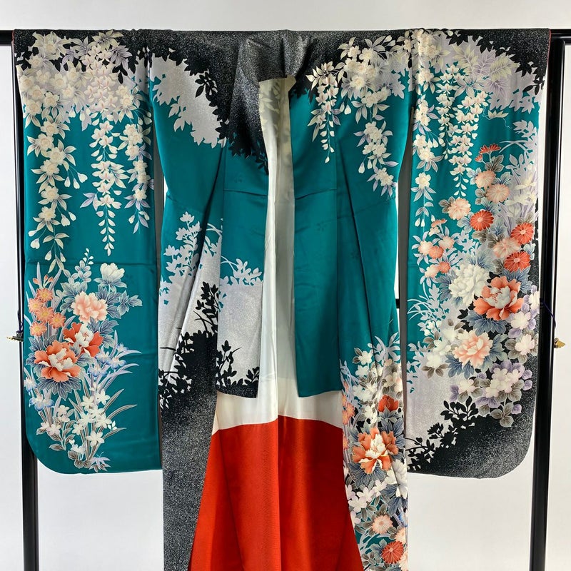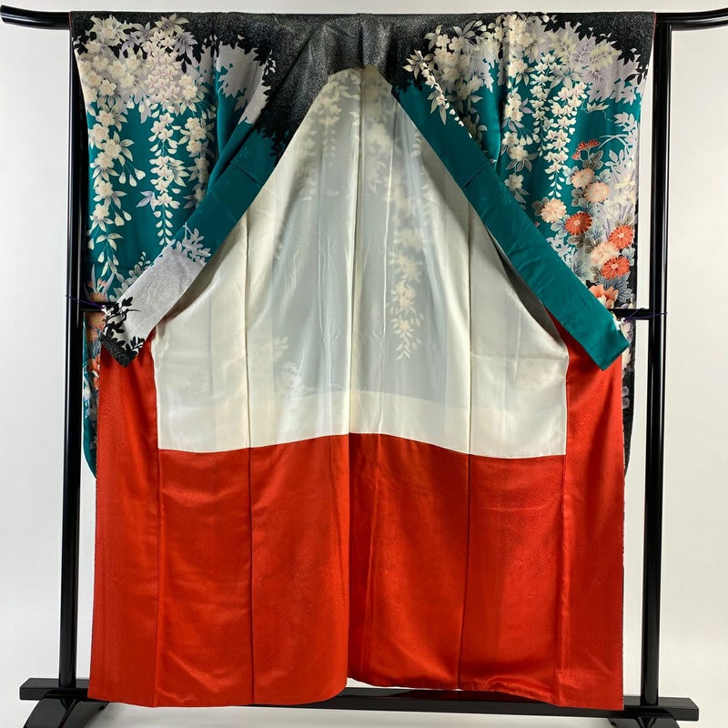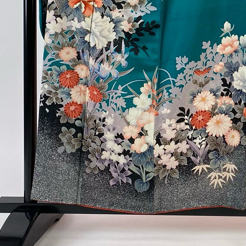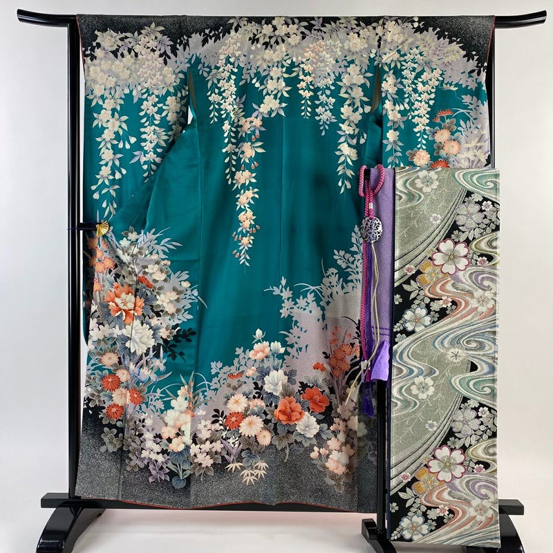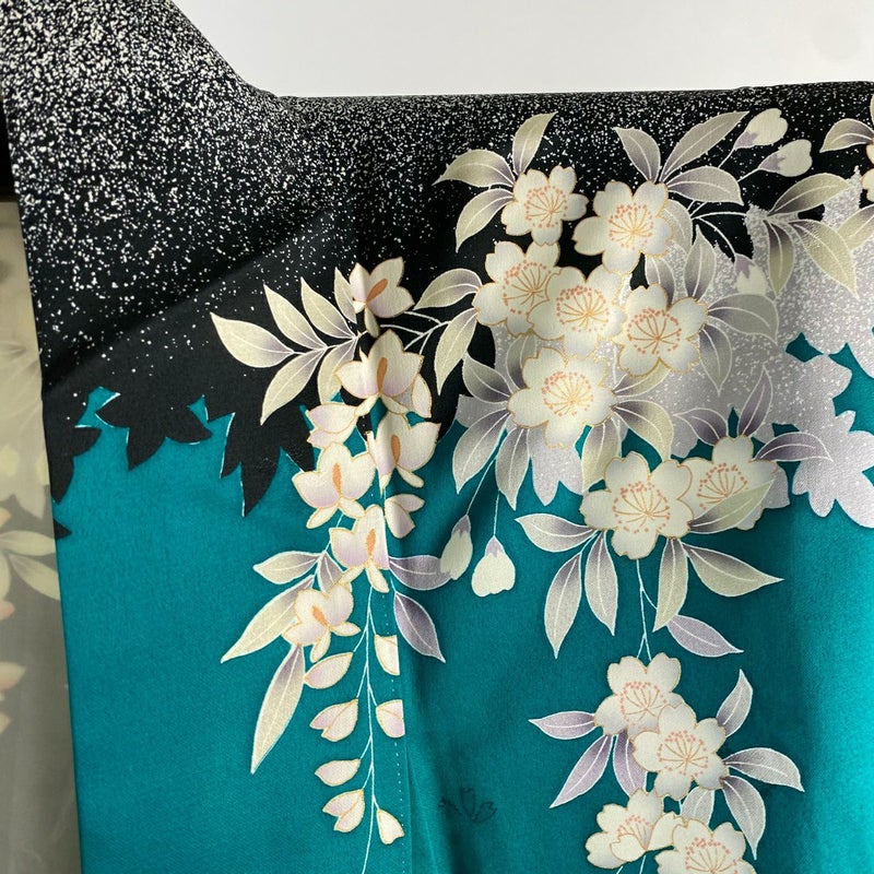 【振袖】 青系 青緑 秀品 A 約150cm~約159cm 裄丈65cm (M)size 袖丈91cm以上 9990-29990 美品 五万以下