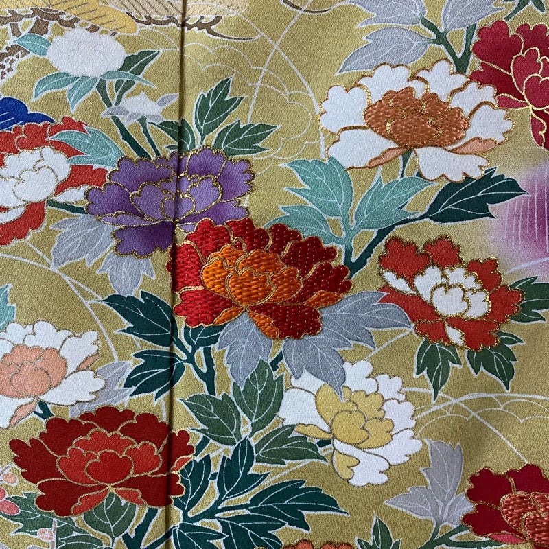 京友禅着物における随一の老舗、千總でございます。 天皇家の調度品をも調えられる千總の品は、芸術品といっても過言ではございません。 未婚女性の第一礼装としてお使いいただける振袖でございます。 お好みの帯や小物と合わせて晴れの日に相応しい華やかな装いにいかがでしょうか。 身丈を+2.0cm程、現在の長さから伸ばせます。 裄丈はこれ以上伸ばすことができません。 衿周りや両袖口中に薄汚れ、表地所々に金彩の変色がございます。 リユース品としては良い状態で、まだまだご活用頂けると思われます。 沢山の商品の中からご覧いただき誠にありがとうございます。