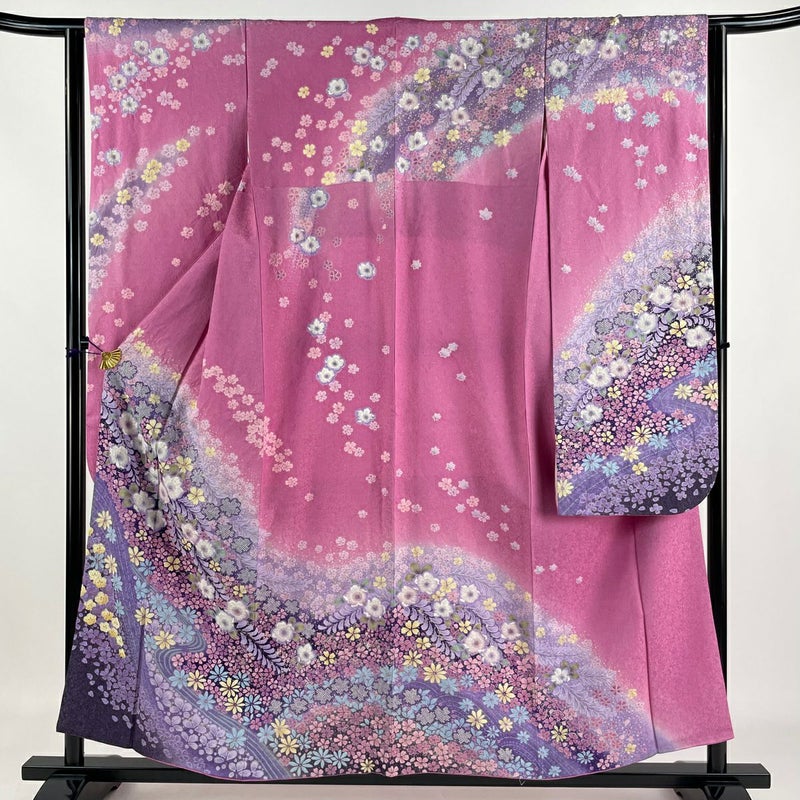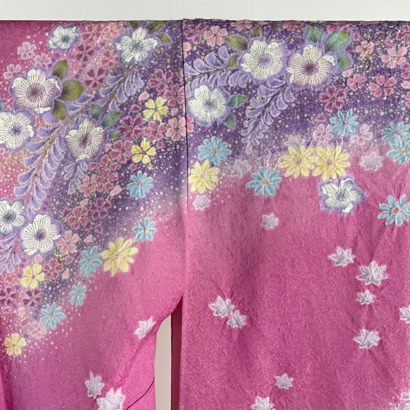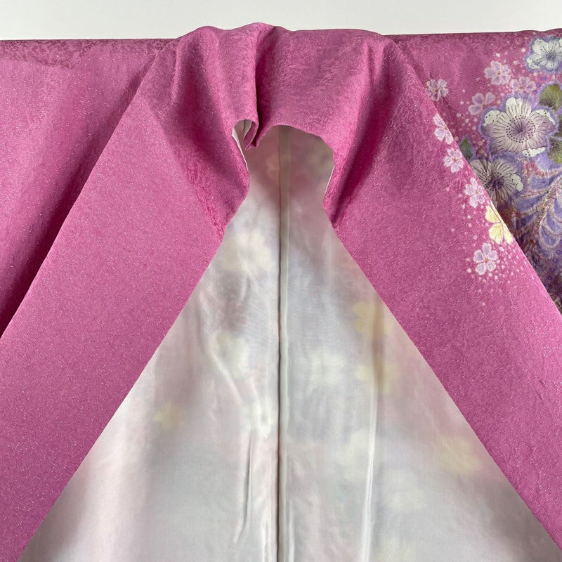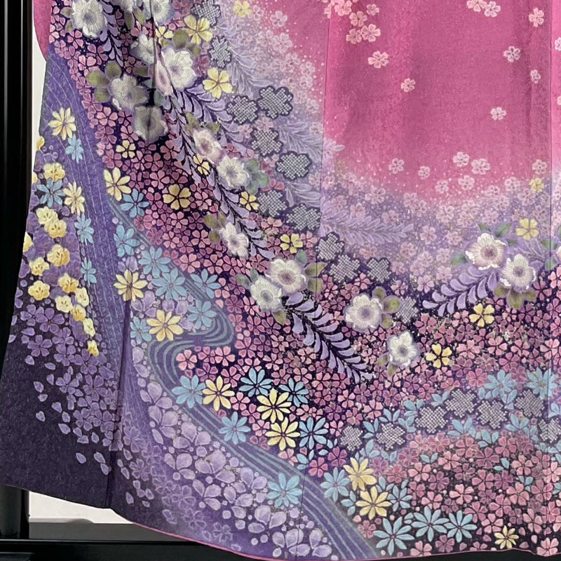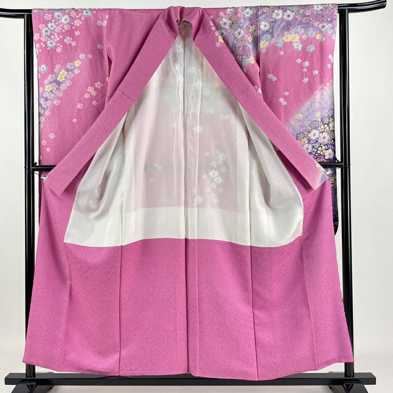 【着物ランク】逸品 【素材】正絹 【身丈】約155.5cm 【裄丈】約63cm 【袖丈】約102cm 【袖幅】約32cm 【前幅】約25cm 【後幅】約30.5cm 【サイズ】S 【着物仕立て】袷 【着用時期】10~5月 【状態ランク】ランクA 【着物着用シーン】成人式、謝恩会