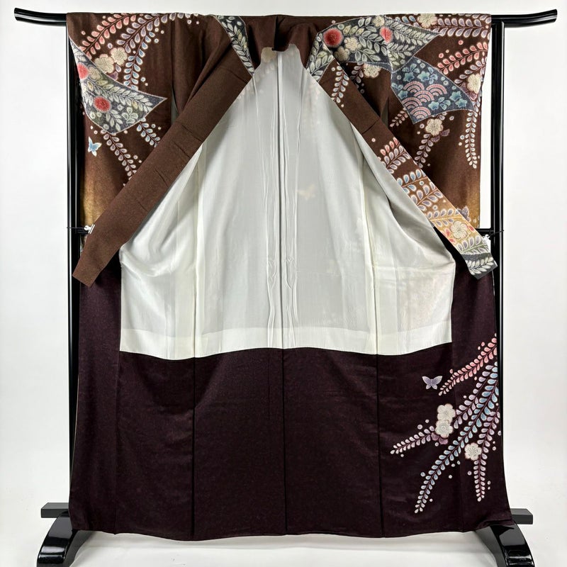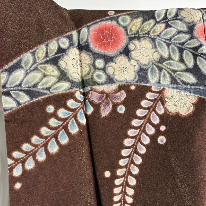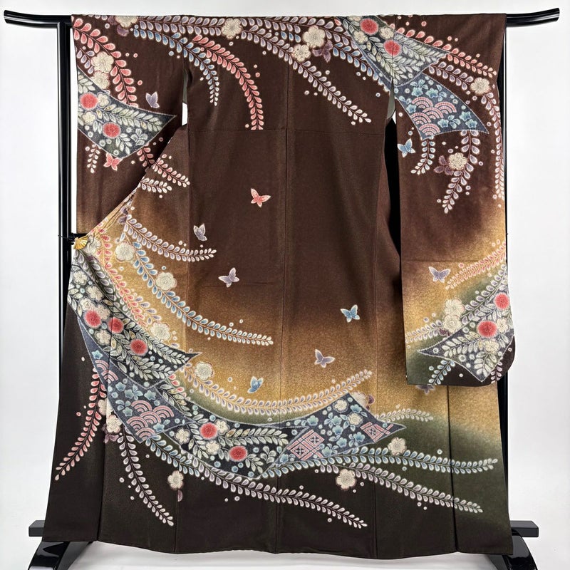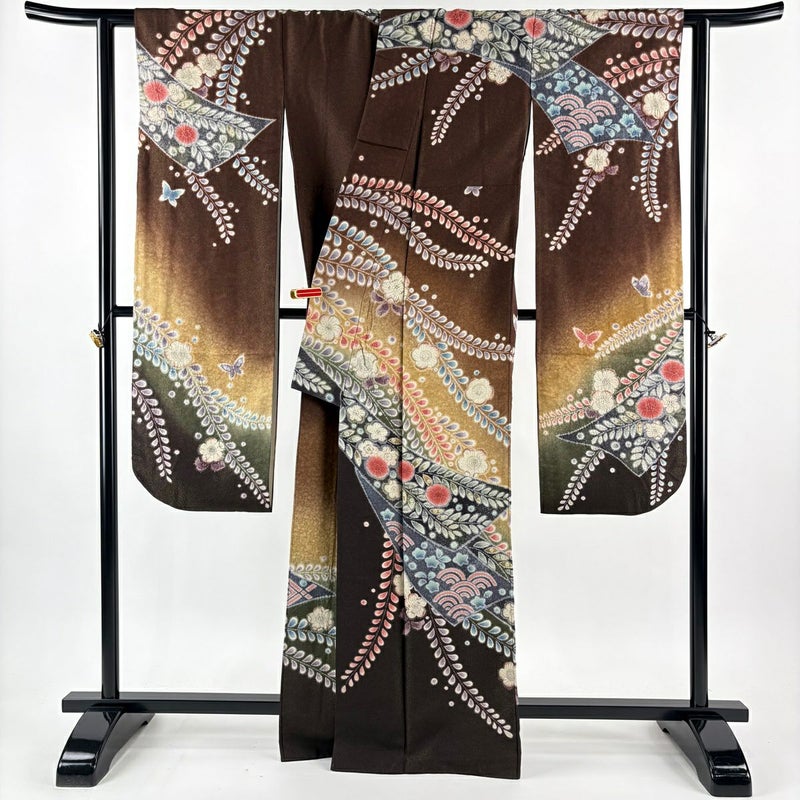 【振袖】 茶系 焦茶色 逸品 A 約160cm~約169cm 裄丈63cm-64cm (M)size 袖丈91cm以上 9990-29990 美品 二万以下
