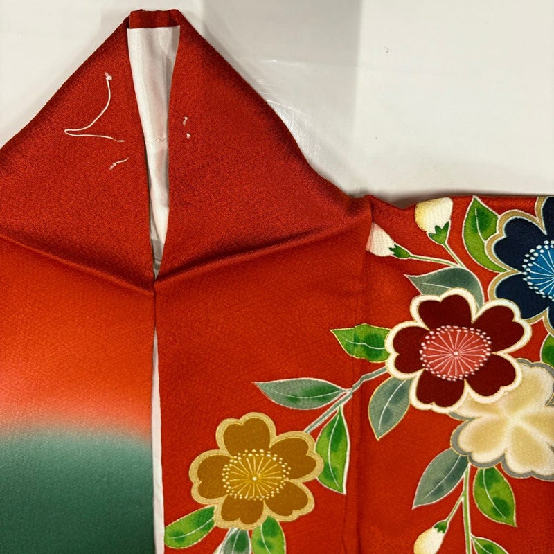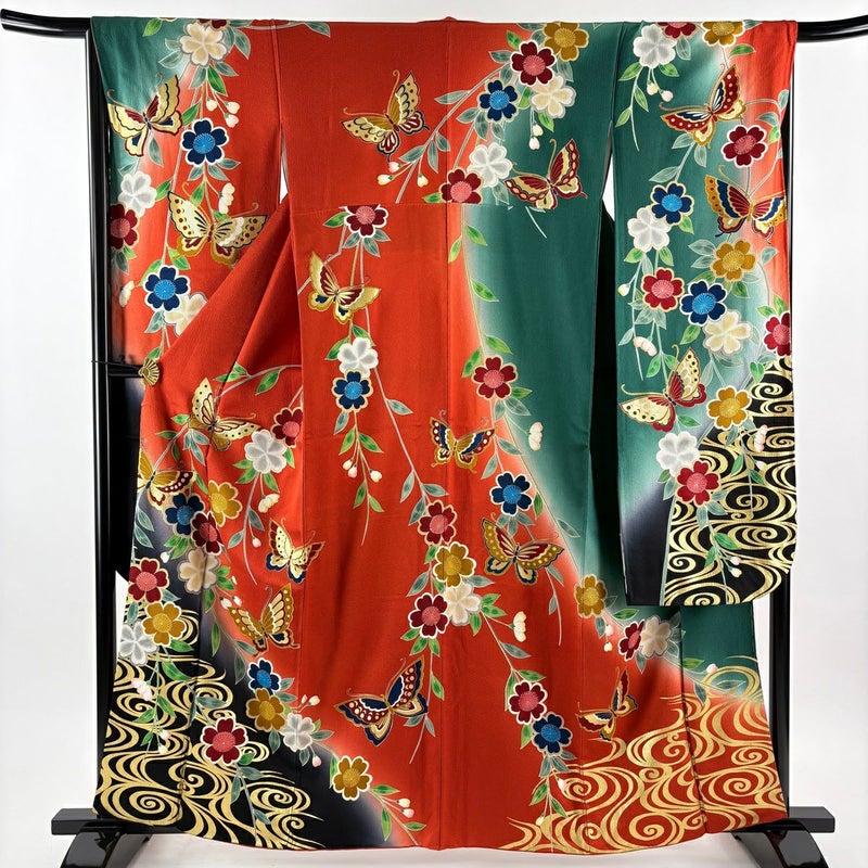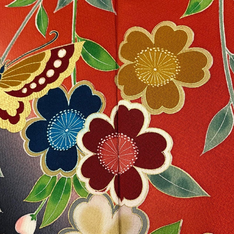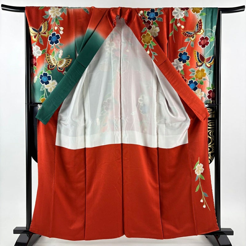 【振袖】 赤系 朱色 秀品 A 約160cm~約169cm 裄丈66cm (M)size 袖丈91cm以上 9990-29990 美品 二万以下