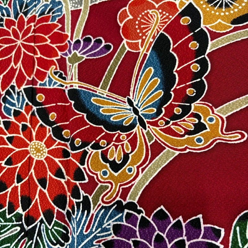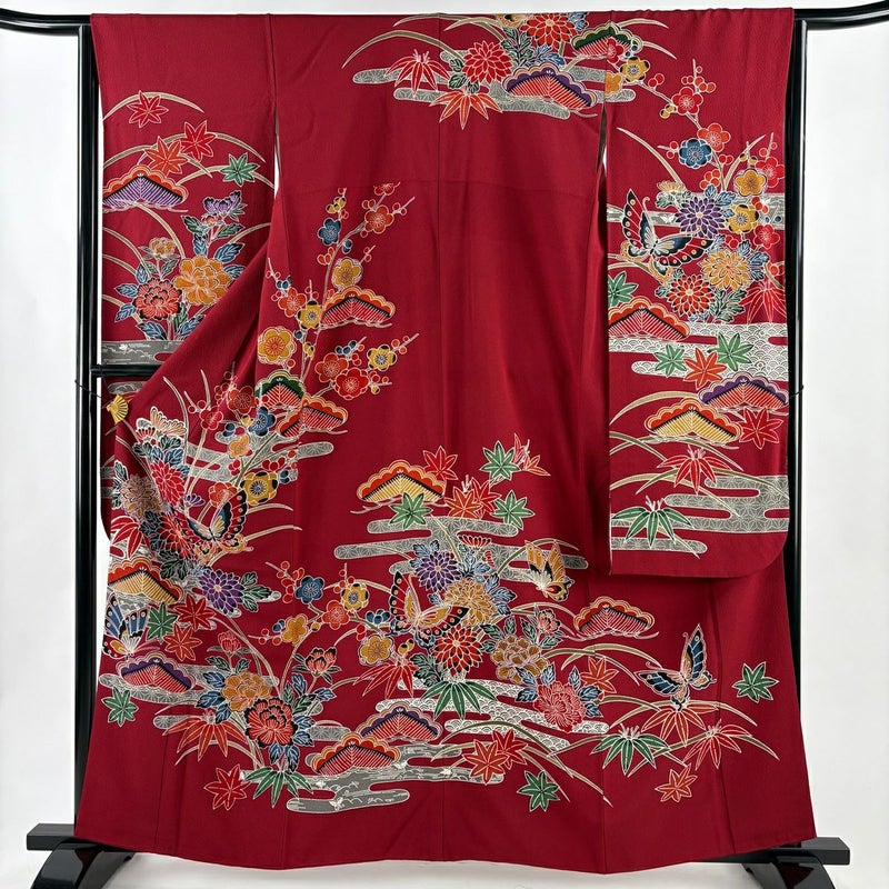 【着物ランク】名品 【素材】正絹 【身丈】約160.5cm 【裄丈】約65cm 【袖丈】約106cm 【袖幅】約33cm 【前幅】約24cm 【後幅】約30cm 【サイズ】M 【着物仕立て】袷 【着用時期】10~5月 【状態ランク】ランクB 【着物着用シーン】成人式、謝恩会