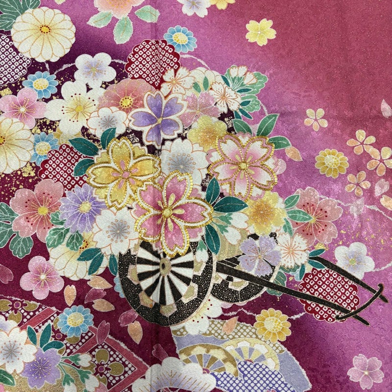 【着物ランク】名品 【素材】正絹 【身丈】約163cm 【裄丈】約66cm 【袖丈】約108cm 【袖幅】約34cm 【前幅】約24.5cm 【後幅】約30cm 【サイズ】M 【着物仕立て】袷 【着用時期】10~5月 【状態ランク】ランクB 【着物着用シーン】成人式、謝恩会