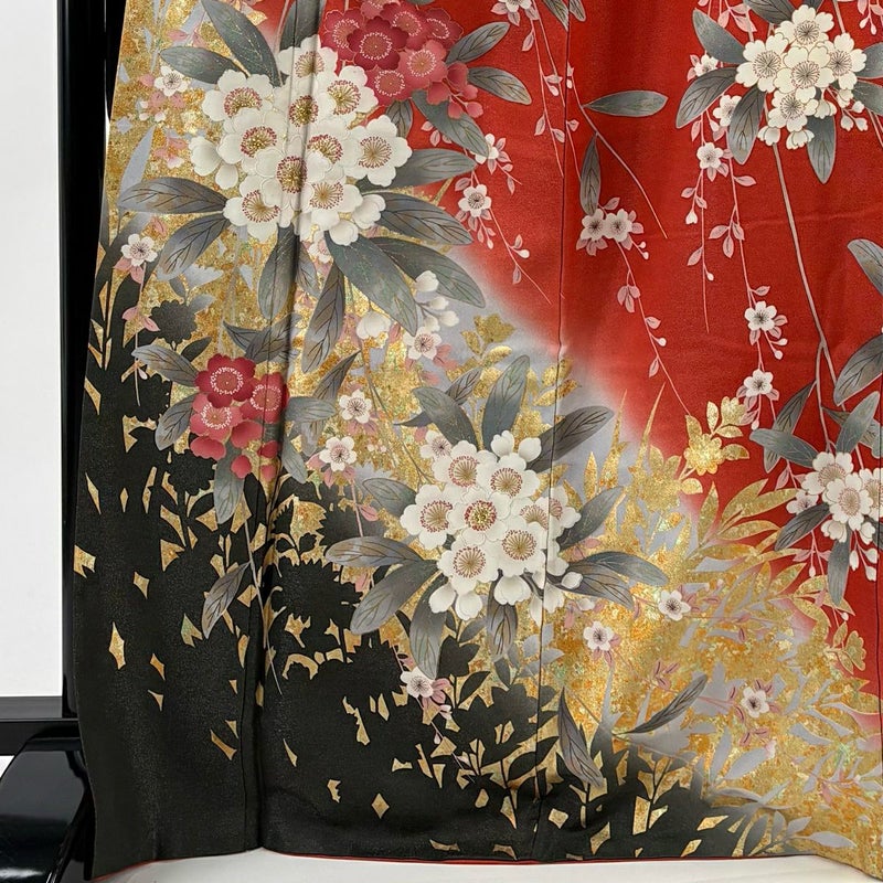 【振袖】 赤系 朱色 名品 A 約170cm~約179cm 裄丈67cm-68cm (L)size 袖丈91cm以上 9990-29990 美品 二万以下