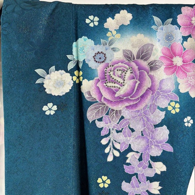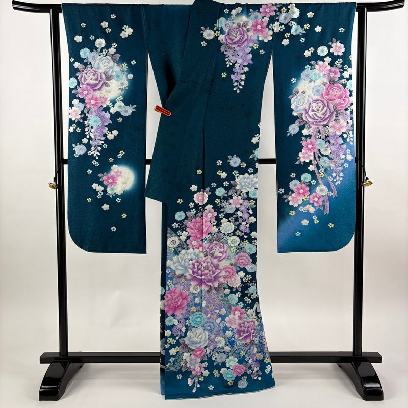 【振袖】 青系 青緑 逸品 B 約160cm~約169cm 裄丈67cm-68cm (L)size 袖丈91cm以上 30000- 五万以下