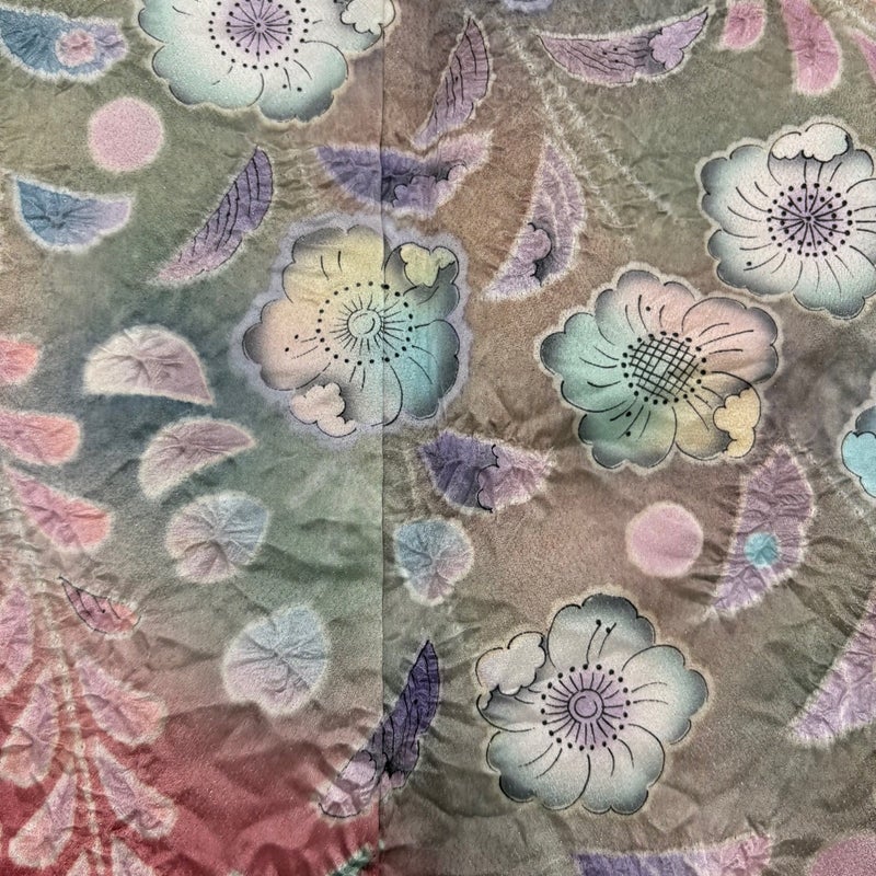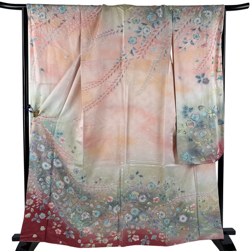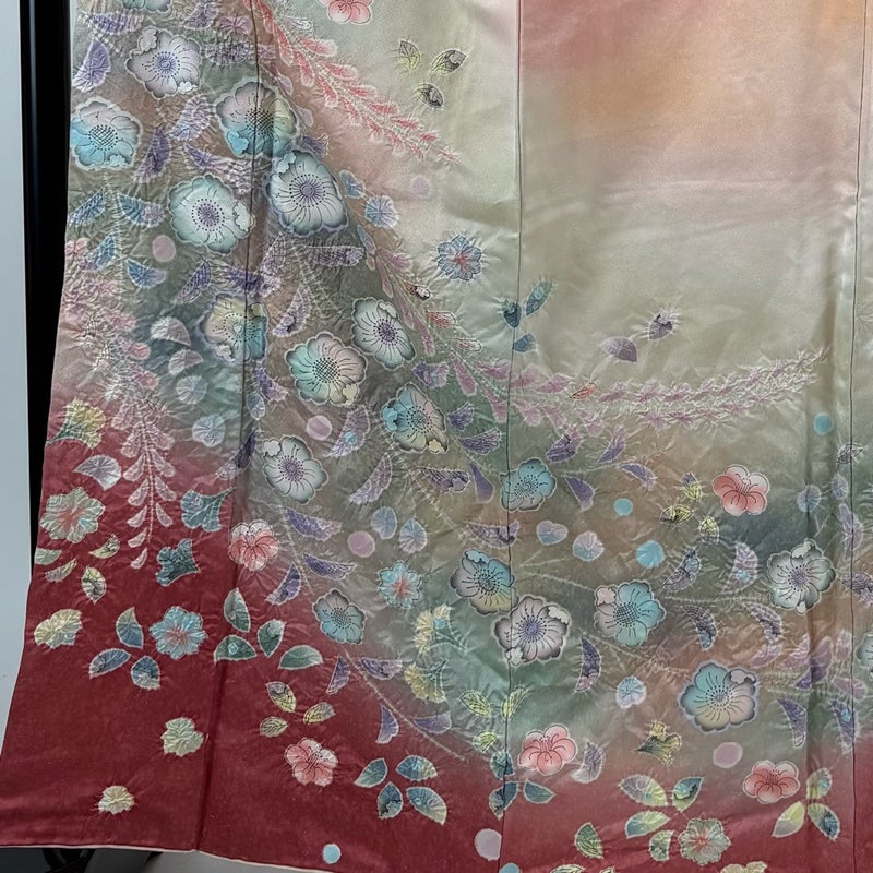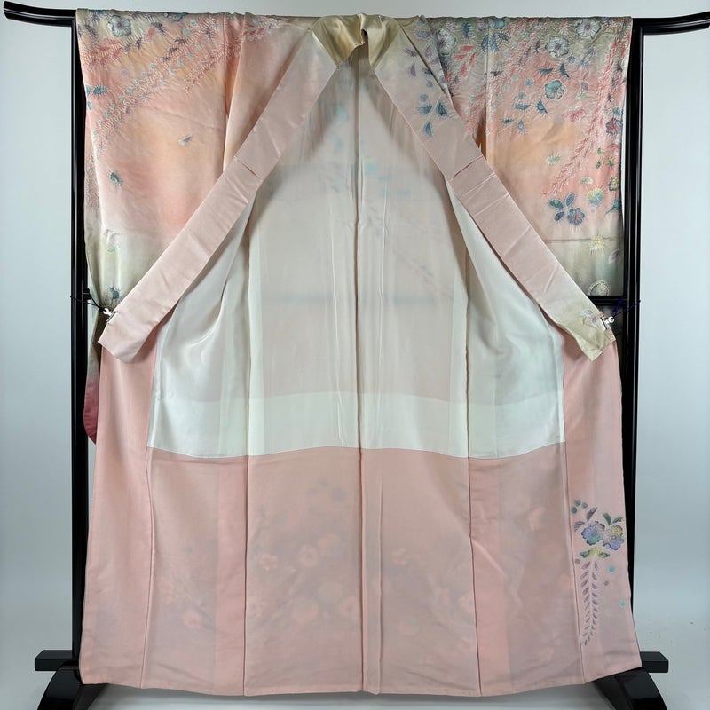 【着物ランク】名品 【素材】正絹 【身丈】約163cm 【裄丈】約69cm 【袖丈】約105cm 【袖幅】約34cm 【前幅】約24.5cm 【後幅】約29cm 【サイズ】L 【着物仕立て】袷 【着用時期】10~5月 【状態ランク】ランクB 【着物着用シーン】成人式、謝恩会