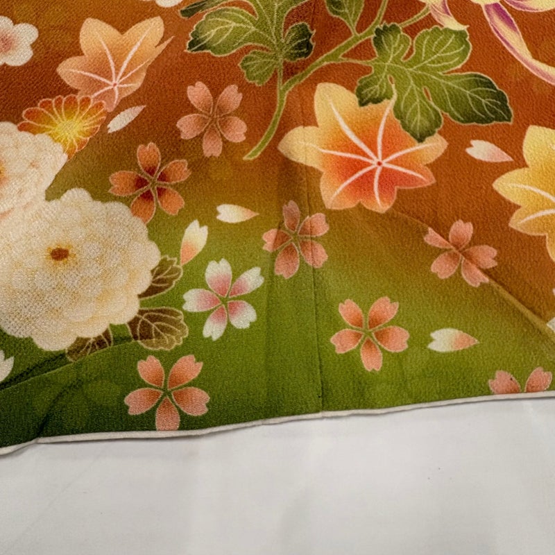 【着物ランク】名品 【素材】正絹 【身丈】約158cm 【裄丈】約66.5cm 【袖丈】約107cm 【袖幅】約35cm 【前幅】約25.5cm 【後幅】約31cm 【サイズ】M 【着物仕立て】袷 【着用時期】10~5月 【状態ランク】ランクA 【着物着用シーン】成人式、謝恩会