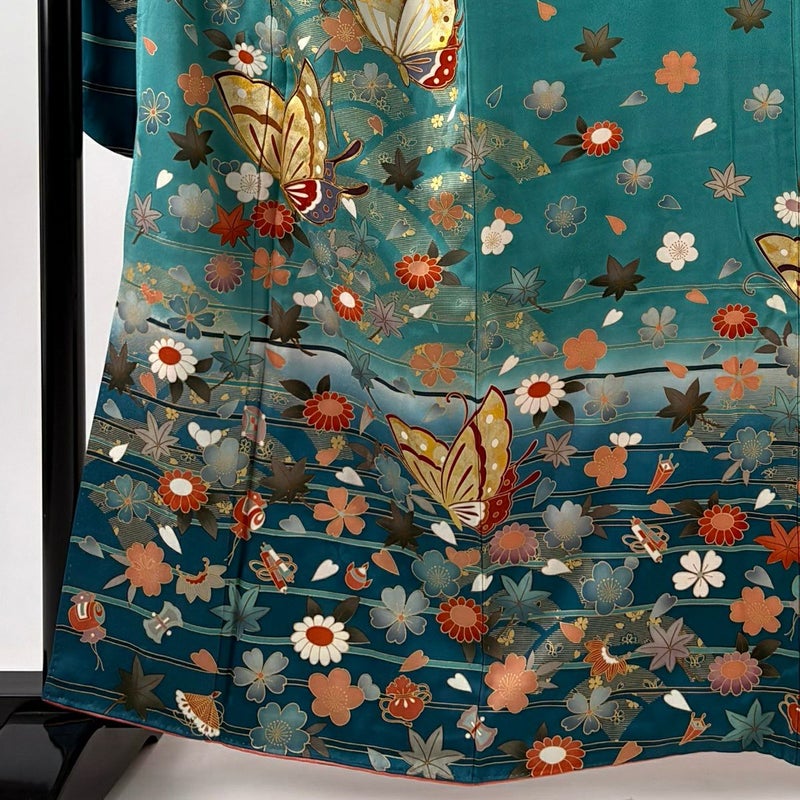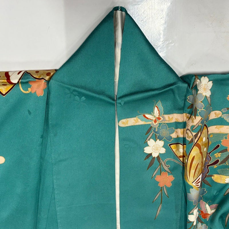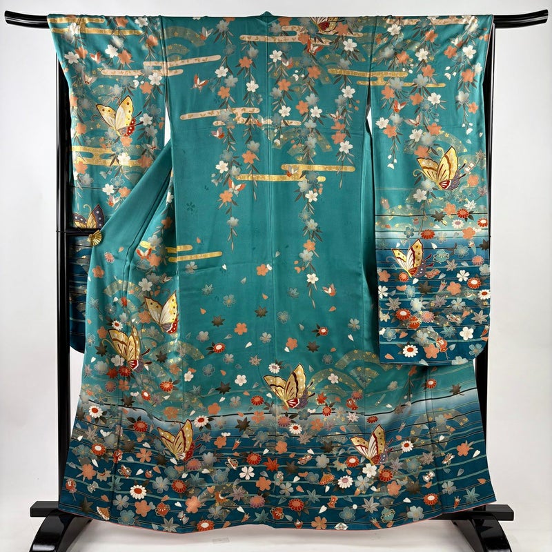 【振袖】 青系 青緑 秀品 B 約160cm~約169cm 裄丈67cm-68cm (M)size 袖丈91cm以上 7990-9980 二万以下