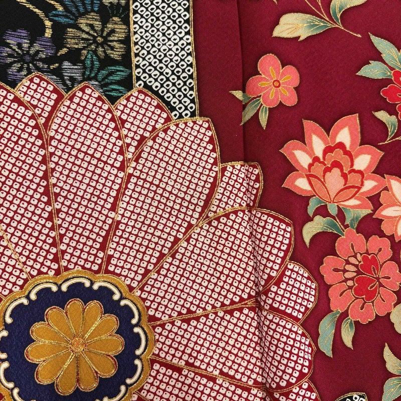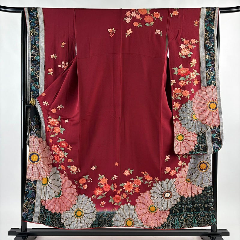 【振袖】 赤系 えんじ色 秀品 B 約150cm~約159cm 裄丈65cm (M)size 袖丈91cm以上 7990-9980 二万以下