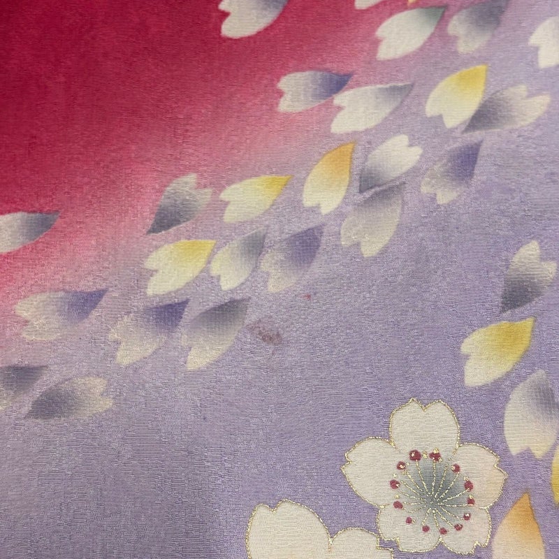 【着物ランク】秀品 【素材】正絹 【身丈】約163.5cm 【裄丈】約67cm 【袖丈】約110.5cm 【袖幅】約34cm 【前幅】約24cm 【後幅】約29cm 【サイズ】M 【着物仕立て】袷 【着用時期】10~5月 【状態ランク】ランクB 【着物着用シーン】成人式、謝恩会