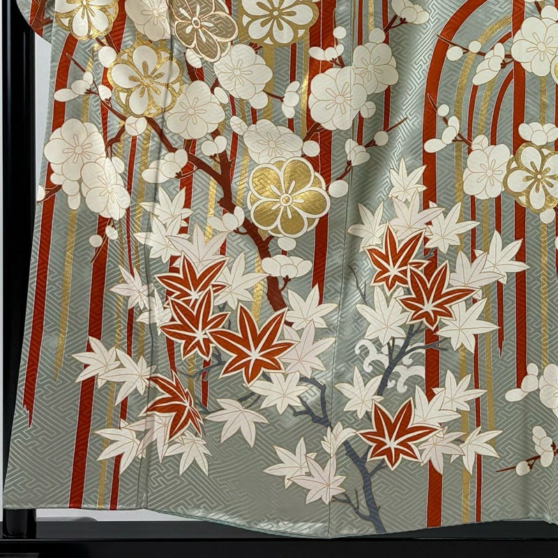 【着物ランク】秀品 【素材】正絹 【身丈】約155.5cm 【裄丈】約65cm 【袖丈】約95.5cm 【袖幅】約33.5cm 【前幅】約24.5cm 【後幅】約30cm 【サイズ】M 【着物仕立て】袷 【着用時期】10~5月 【状態ランク】ランクB 【着物着用シーン】成人式、謝恩会
