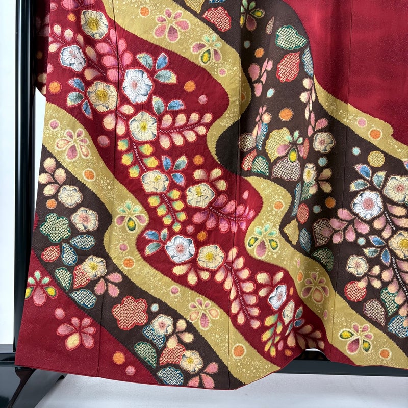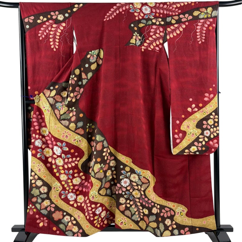 【振袖】 赤系 えんじ色 逸品 B 約150cm~約159cm 裄丈66cm (M)size 袖丈91cm以上 30000- 五万以下