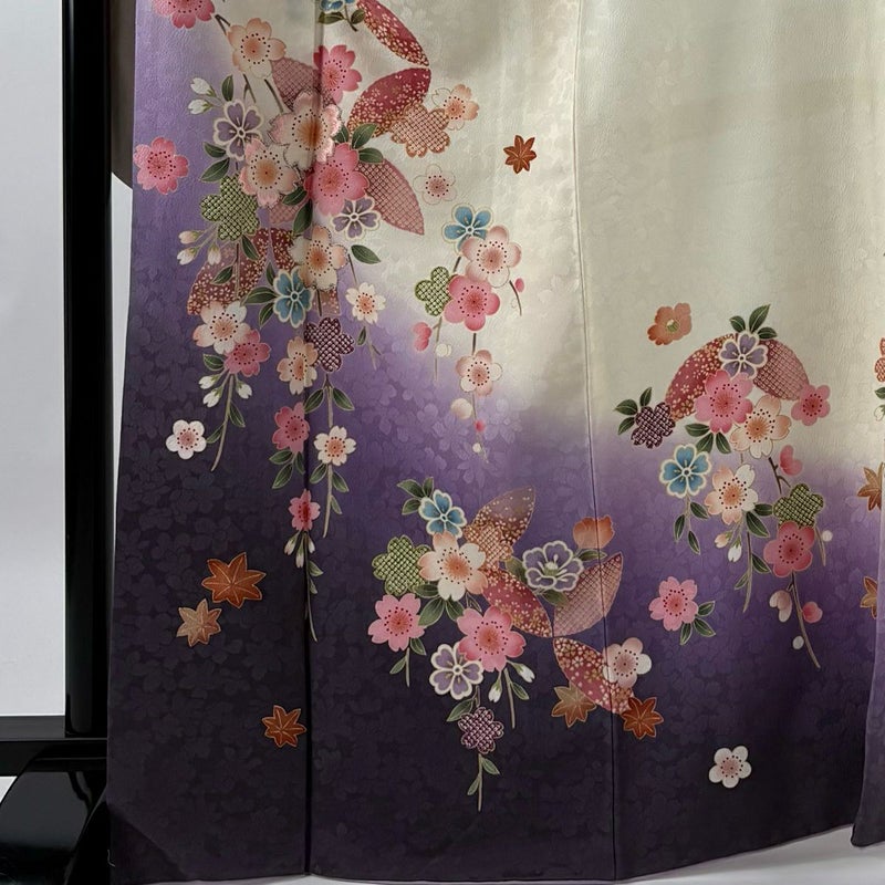 【着物ランク】名品 【素材】正絹 【身丈】約167cm 【裄丈】約69.5cm 【袖丈】約113cm 【袖幅】約36cm 【前幅】約26cm 【後幅】約30.5cm 【サイズ】L 【着物仕立て】袷 【着用時期】10~5月 【状態ランク】ランクB 【着物着用シーン】成人式、謝恩会