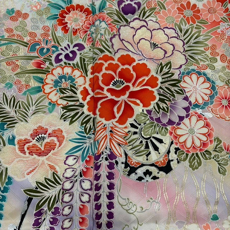 【着物ランク】優品 【素材】正絹 【身丈】約160cm 【裄丈】約67cm 【袖丈】約112.5cm 【袖幅】約34cm 【前幅】約24.5cm 【後幅】約29.5cm 【サイズ】M 【着物仕立て】袷 【着用時期】10~5月 【状態ランク】ランクA 【着物着用シーン】成人式、謝恩会