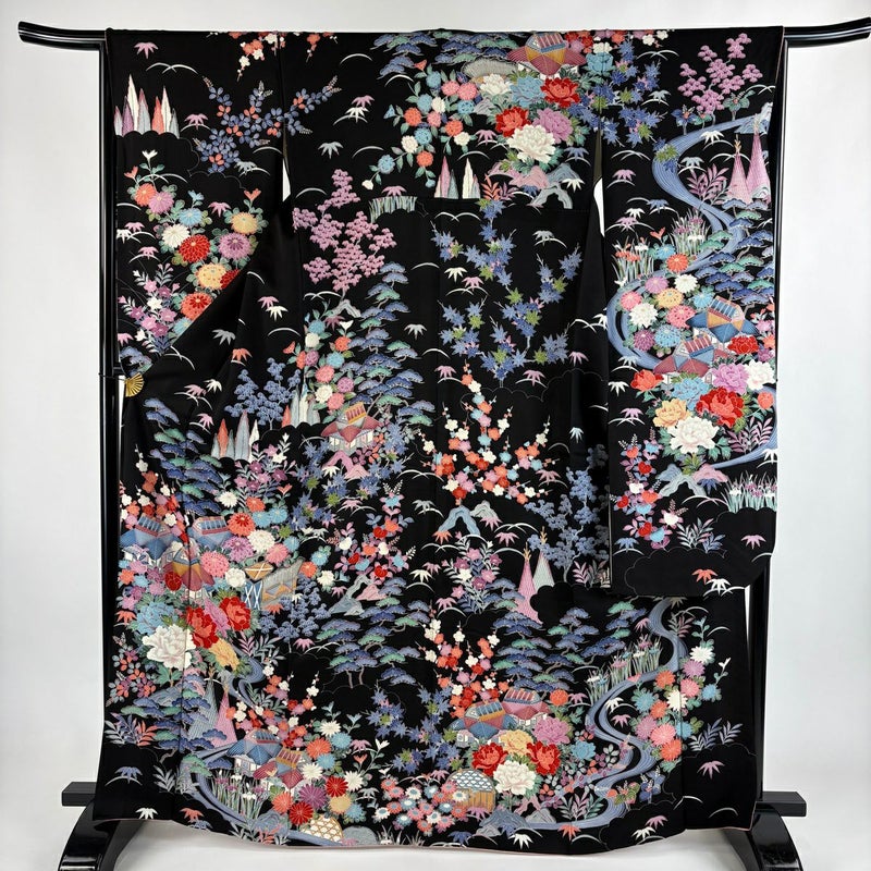 【振袖】 黒系 黒 秀品 B 約160cm~約169cm 裄丈66cm (M)size 袖丈91cm以上 7990-9980 二万以下