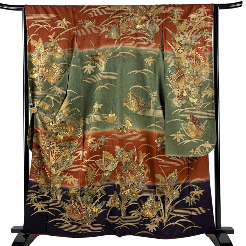 【着物ランク】秀品 【素材】正絹 【身丈】約162cm 【裄丈】約64.5cm 【袖丈】約105.5cm 【袖幅】約33.5cm 【前幅】約24cm 【後幅】約29cm 【サイズ】M 【着物仕立て】袷 【着用時期】10~5月 【状態ランク】ランクB 【着物着用シーン】成人式、謝恩会