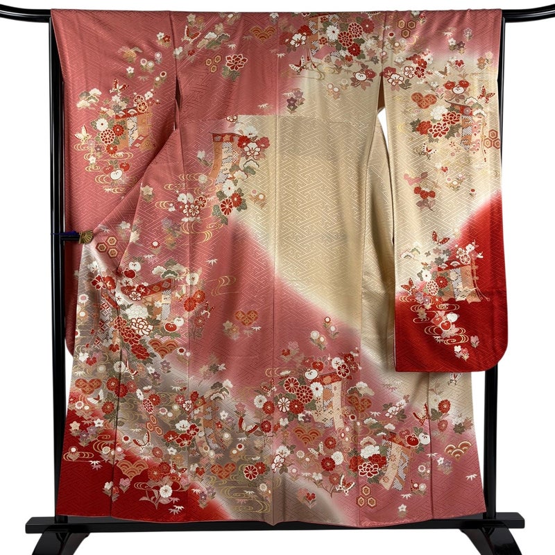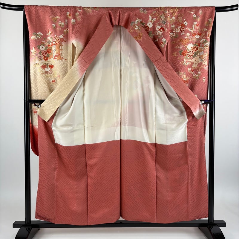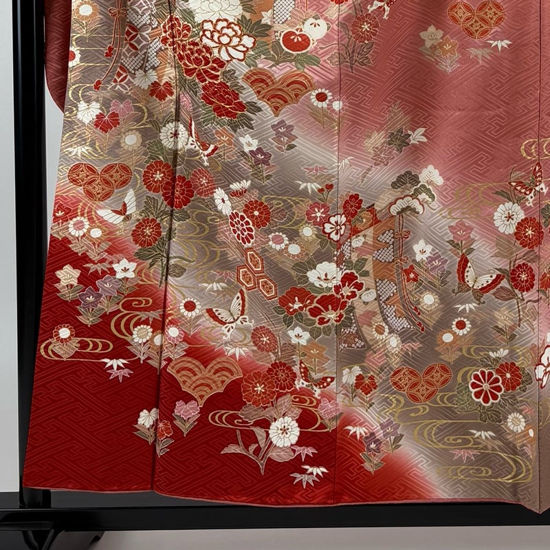 【振袖】 赤系 ピンク 秀品 B 約150cm~約159cm 裄丈65cm (M)size 袖丈91cm以上 7990-9980 二万以下