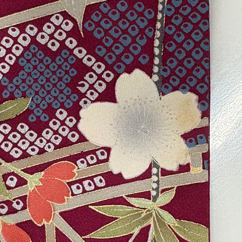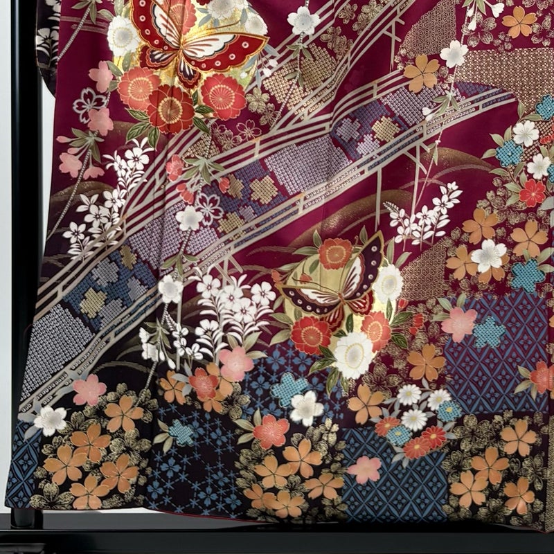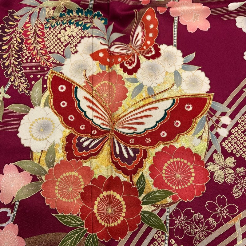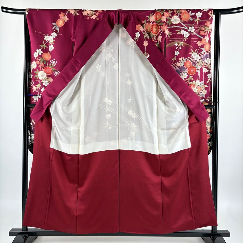 【着物ランク】秀品 【素材】正絹 【身丈】約157cm 【裄丈】約64cm 【袖丈】約104cm 【袖幅】約33cm 【前幅】約23cm 【後幅】約30cm 【サイズ】M 【着物仕立て】袷 【着用時期】10~5月 【状態ランク】ランクA 【着物着用シーン】成人式、謝恩会