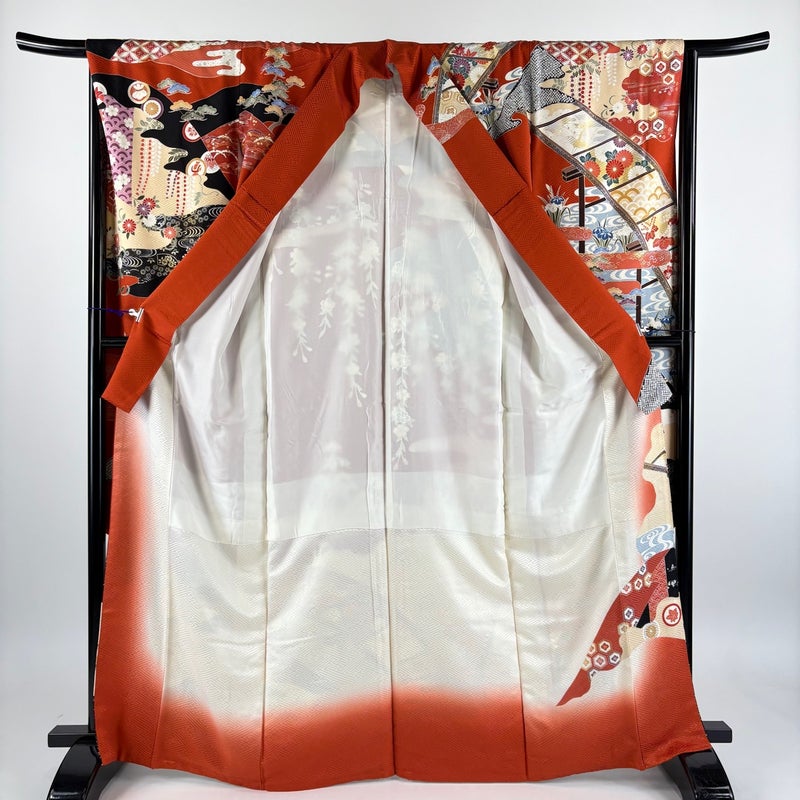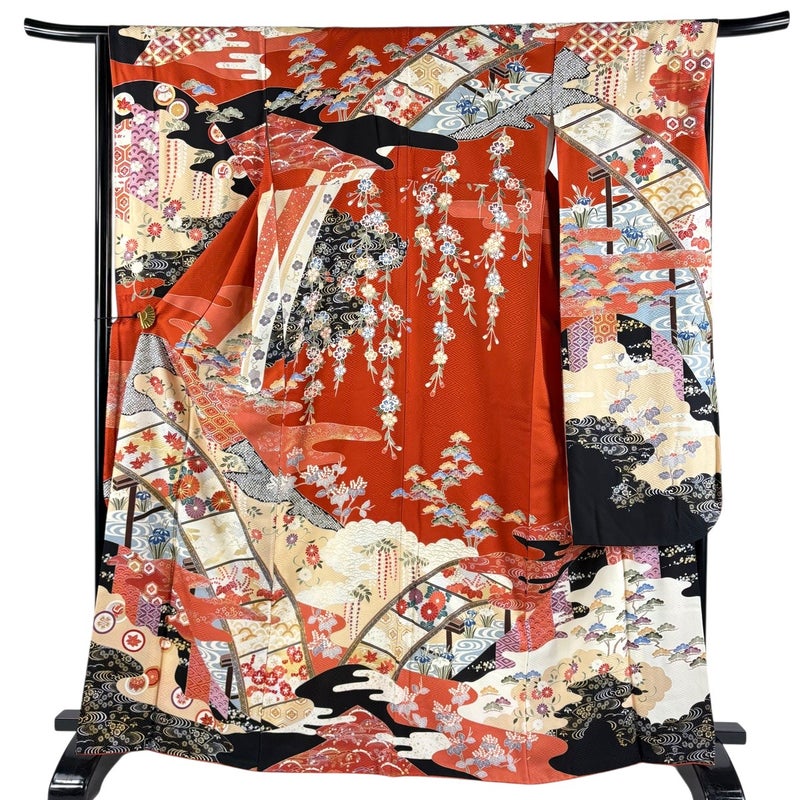 【振袖】 赤系 朱色 秀品 A 約160cm~約169cm 裄丈66cm (M)size 袖丈91cm以上 9990-29990 美品 二万以下