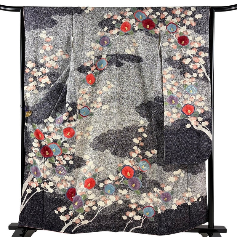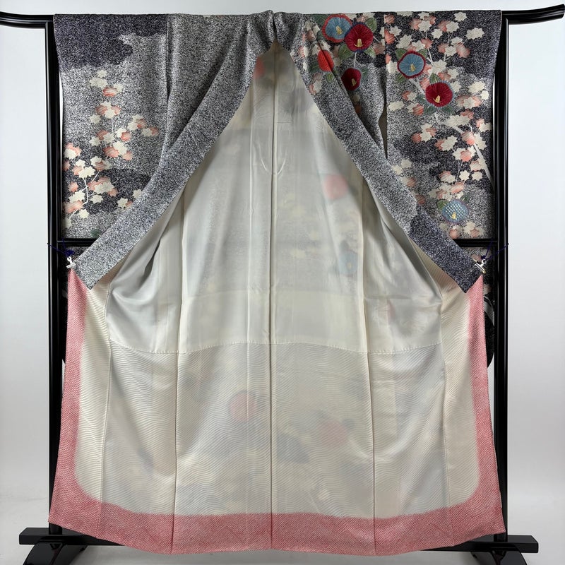 【振袖】 灰色系 黒灰 秀品 A 約160cm~約169cm 裄丈63cm-64cm (M)size 袖丈91cm以上 9990-29990 美品 二万以下