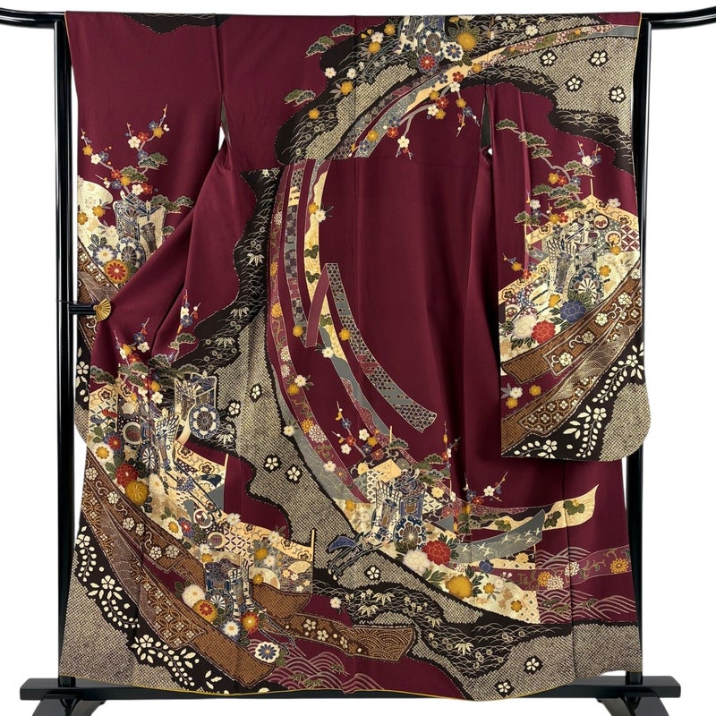 【振袖】 赤系 えんじ色 秀品 B 約150cm~約159cm 裄丈63cm-64cm (M)size 袖丈91cm以上 7990-9980 二万以下