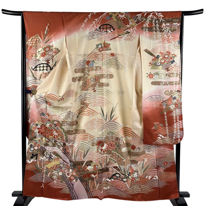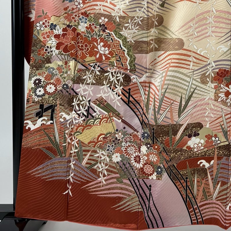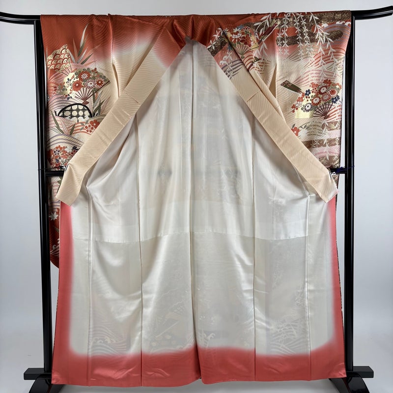 【振袖】 赤系 薄オレンジ 秀品 B 約160cm~約169cm 裄丈65cm (M)size 袖丈91cm以上 7990-9980 二万以下