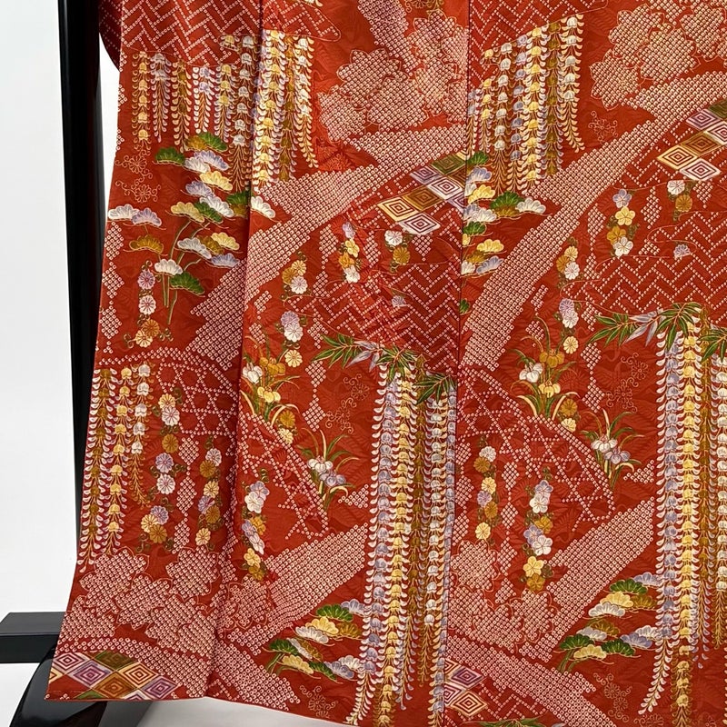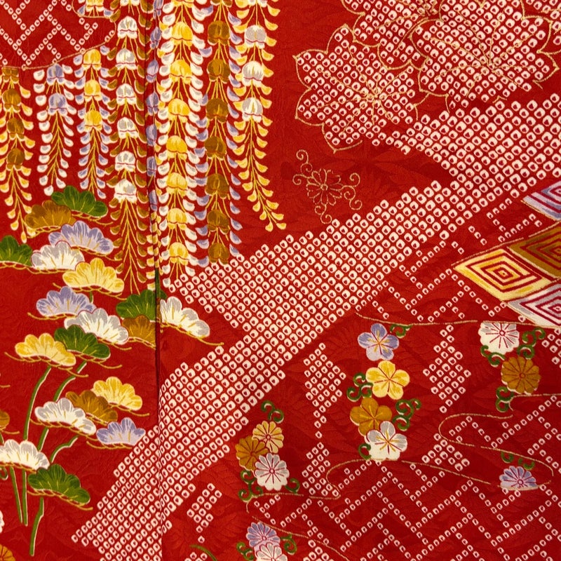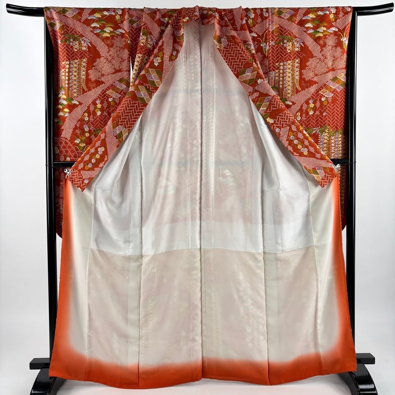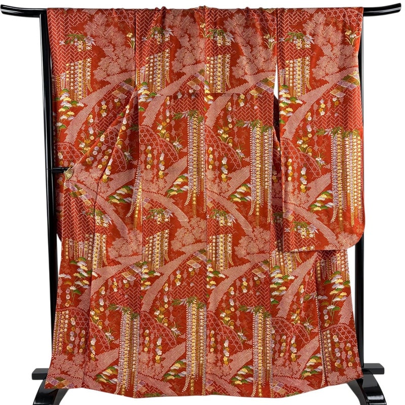 【振袖】 赤系 朱色 秀品 A 約160cm~約169cm 裄丈69cm以上 (L)size 袖丈91cm以上 9990-29990 美品 二万以下