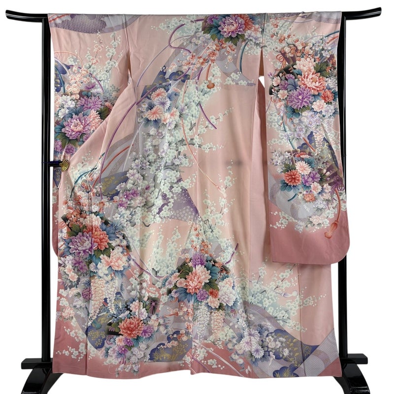 【着物ランク】秀品 【素材】正絹 【身丈】約162.5cm 【裄丈】約65.5cm 【袖丈】約112cm 【袖幅】約33.5cm 【前幅】約24cm 【後幅】約29cm 【サイズ】M 【着物仕立て】袷 【着用時期】10~5月 【状態ランク】ランクB 【着物着用シーン】成人式、謝恩会