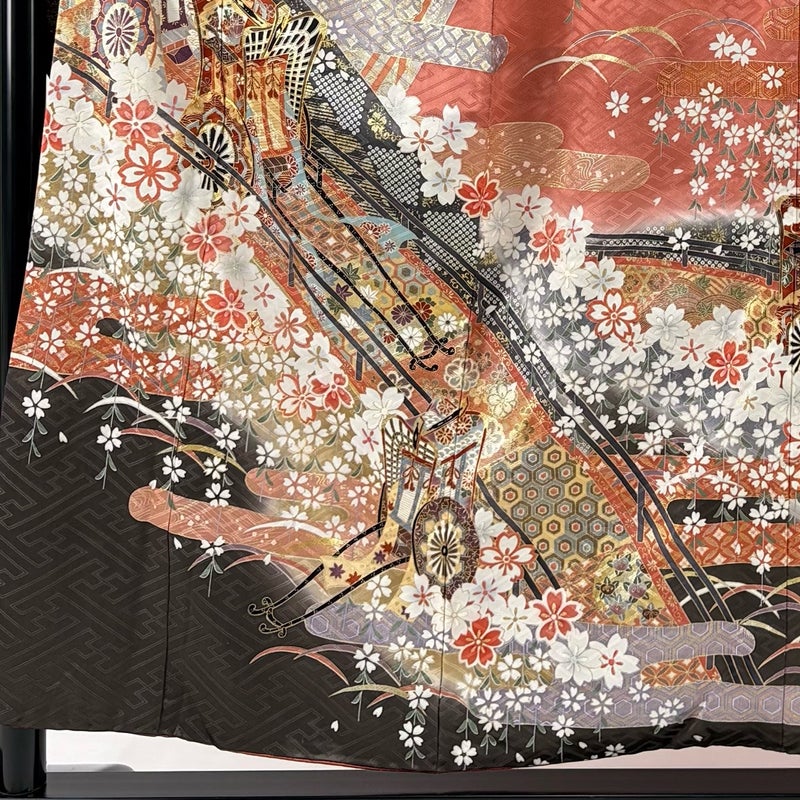 【着物ランク】逸品 【素材】正絹 【身丈】約155cm 【裄丈】約66cm 【袖丈】約101cm 【袖幅】約34cm 【前幅】約23cm 【後幅】約29cm 【サイズ】M 【着物仕立て】袷 【着用時期】10~5月 【状態ランク】ランクB 【着物着用シーン】成人式、謝恩会