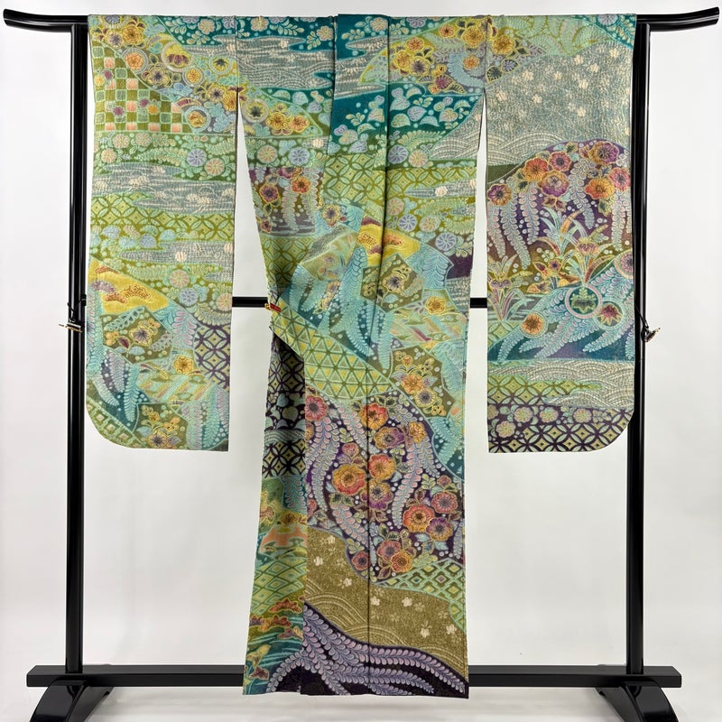 【振袖】 青系 青緑 逸品 B 約150cm~約159cm 裄丈65cm (M)size 袖丈91cm以上 30000- 五万以下