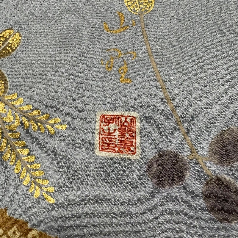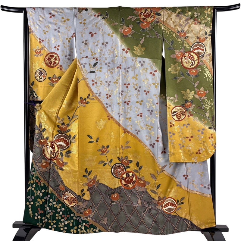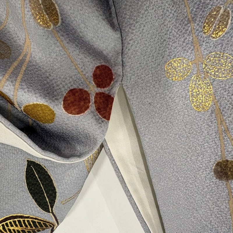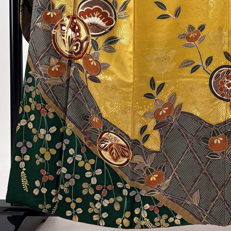 【着物ランク】名品 【素材】正絹 【身丈】約161cm 【裄丈】約64cm 【袖丈】約108cm 【袖幅】約33cm 【前幅】約24.5cm 【後幅】約30cm 【サイズ】M 【着物仕立て】袷 【着用時期】10~5月 【状態ランク】ランクC 【着物着用シーン】成人式、謝恩会