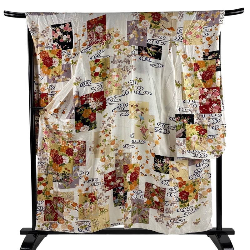 【着物ランク】秀品 【素材】正絹 【身丈】約156.5cm 【裄丈】約68cm 【袖丈】約105cm 【袖幅】約34cm 【前幅】約25cm 【後幅】約29cm 【サイズ】L 【着物仕立て】袷 【着用時期】10~5月 【状態ランク】ランクB 【着物着用シーン】成人式、謝恩会