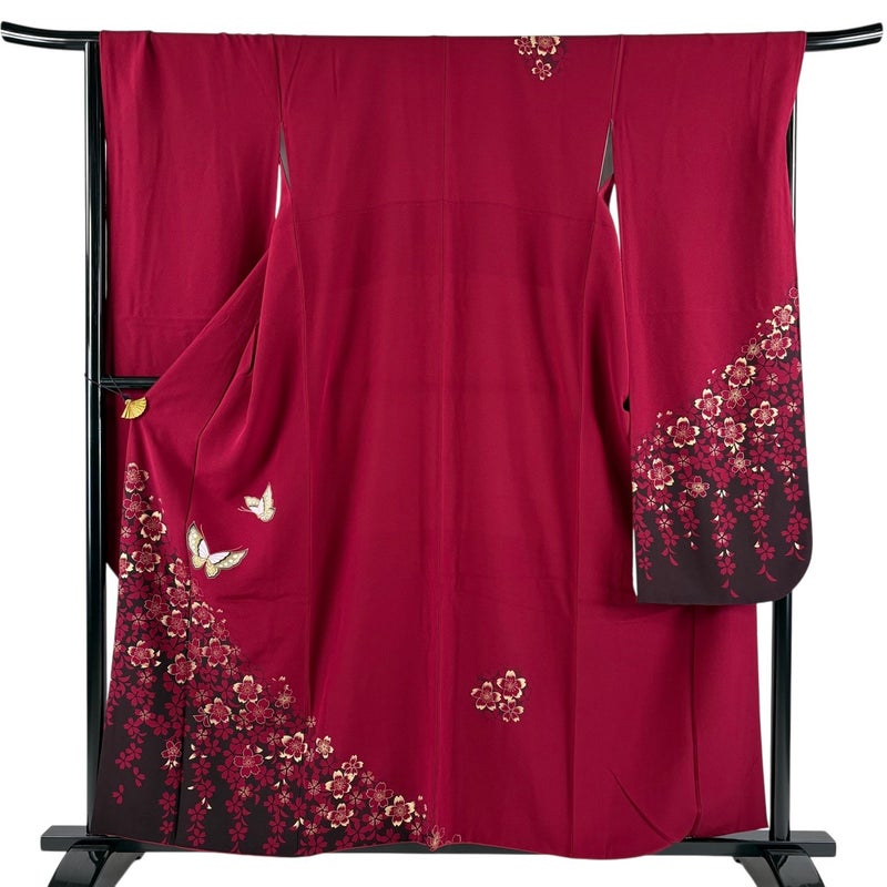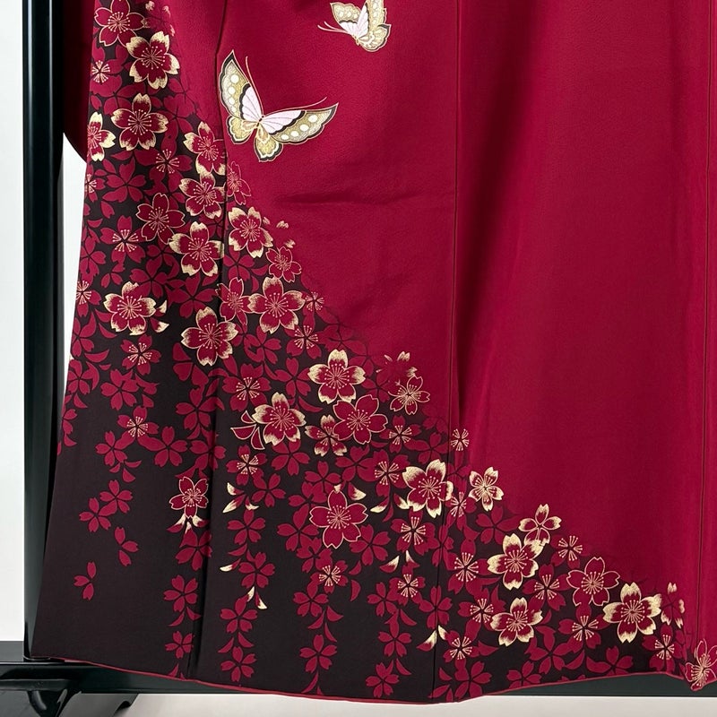 【振袖】 赤系 えんじ色 秀品 A 約150cm~約159cm 裄丈67cm-68cm (M)size 袖丈91cm以上 9990-29990 美品 二万以下
