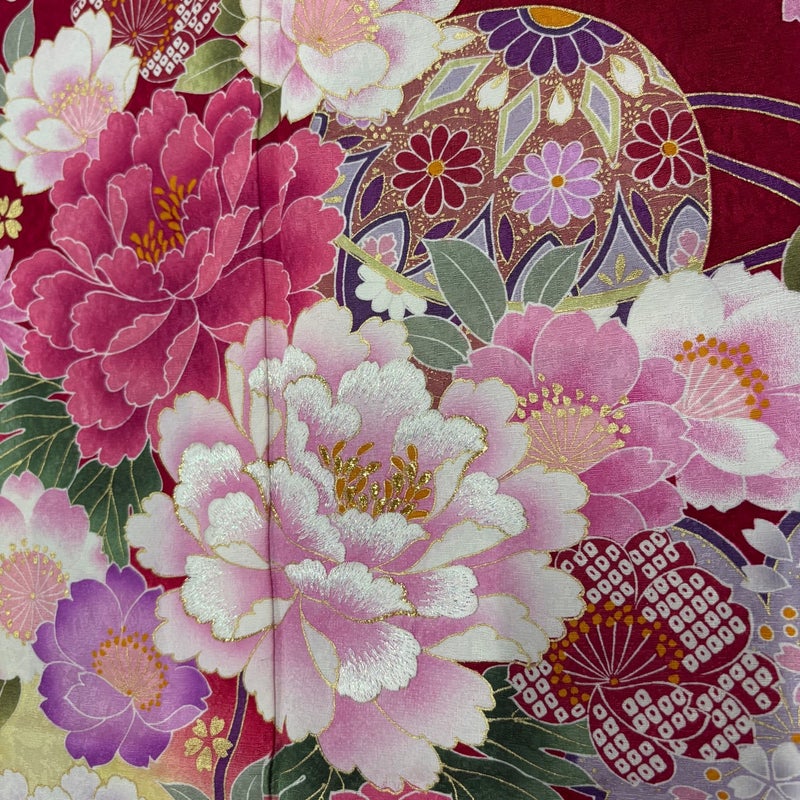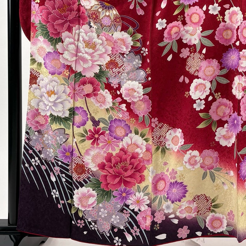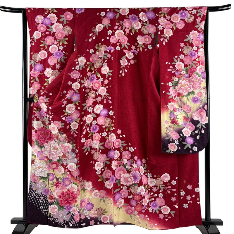 【着物ランク】名品 【素材】正絹 【身丈】約161.5cm 【裄丈】約64cm 【袖丈】約107cm 【袖幅】約33.5cm 【前幅】約24cm 【後幅】約29cm 【サイズ】M 【着物仕立て】袷 【着用時期】10~5月 【状態ランク】ランクA 【着物着用シーン】成人式、謝恩会
