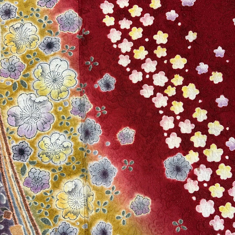 【着物ランク】名品 【素材】正絹 【身丈】約153.5cm 【裄丈】約64.5cm 【袖丈】約109cm 【袖幅】約33cm 【前幅】約23.5cm 【後幅】約29cm 【サイズ】M 【着物仕立て】袷 【着用時期】10~5月 【状態ランク】ランクB 【着物着用シーン】成人式、謝恩会