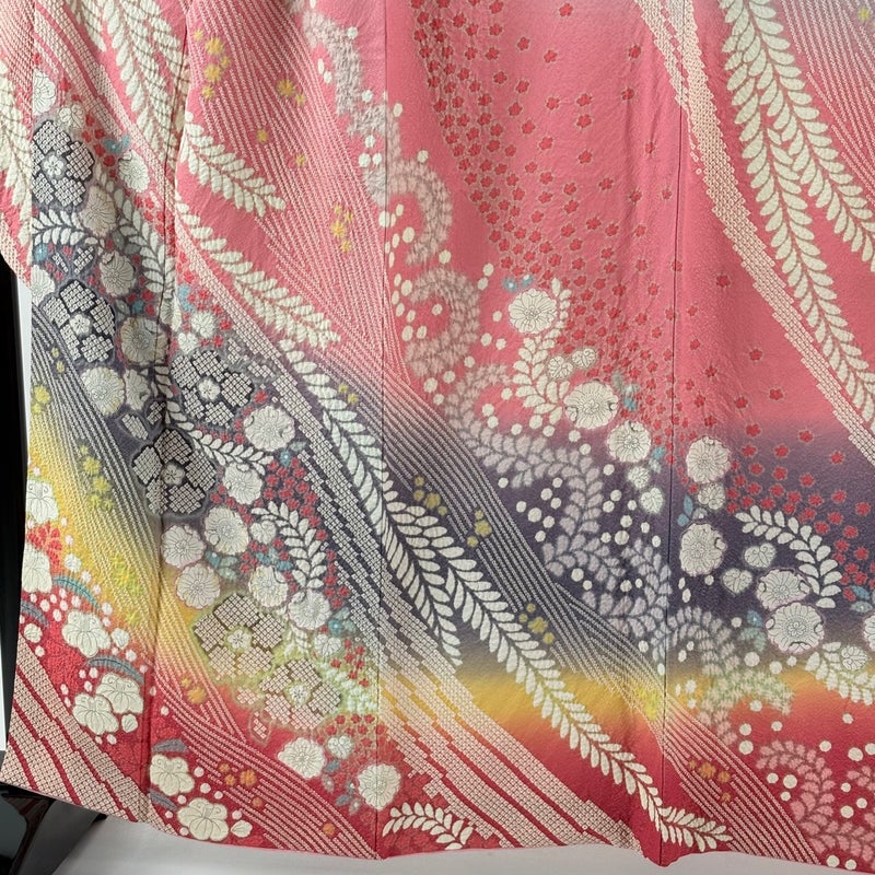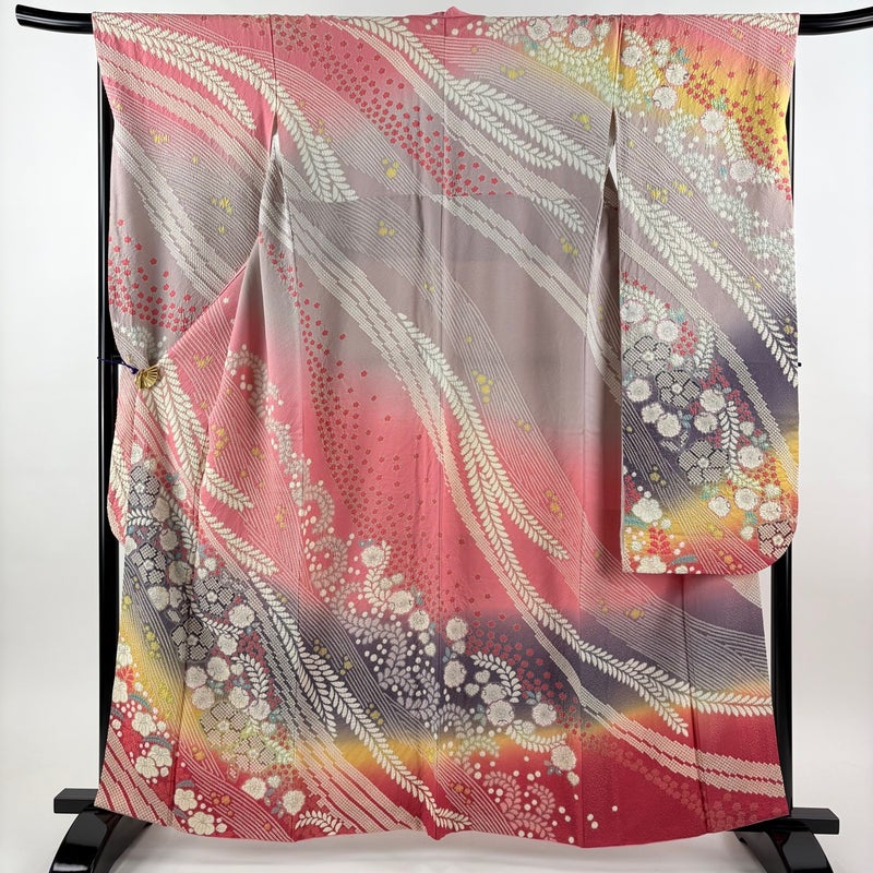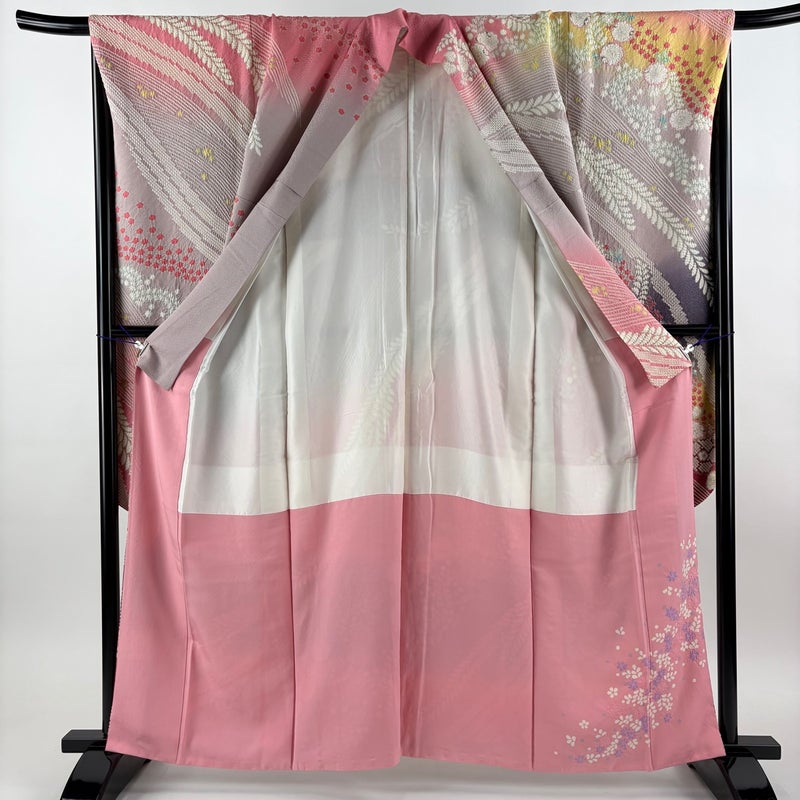 【着物ランク】名品 【素材】正絹 【身丈】約160.5cm 【裄丈】約68cm 【袖丈】約109cm 【袖幅】約34.5cm 【前幅】約25cm 【後幅】約30.5cm 【サイズ】L 【着物仕立て】袷 【着用時期】10~5月 【状態ランク】ランクA 【着物着用シーン】成人式、謝恩会