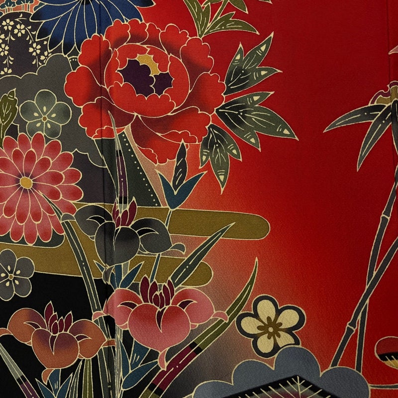 【着物ランク】名品 【素材】正絹 【身丈】約158.5cm 【裄丈】約66cm 【袖丈】約106cm 【袖幅】約34.5cm 【前幅】約24cm 【後幅】約29cm 【サイズ】M 【着物仕立て】袷 【着用時期】10~5月 【状態ランク】ランクA 【着物着用シーン】成人式、謝恩会