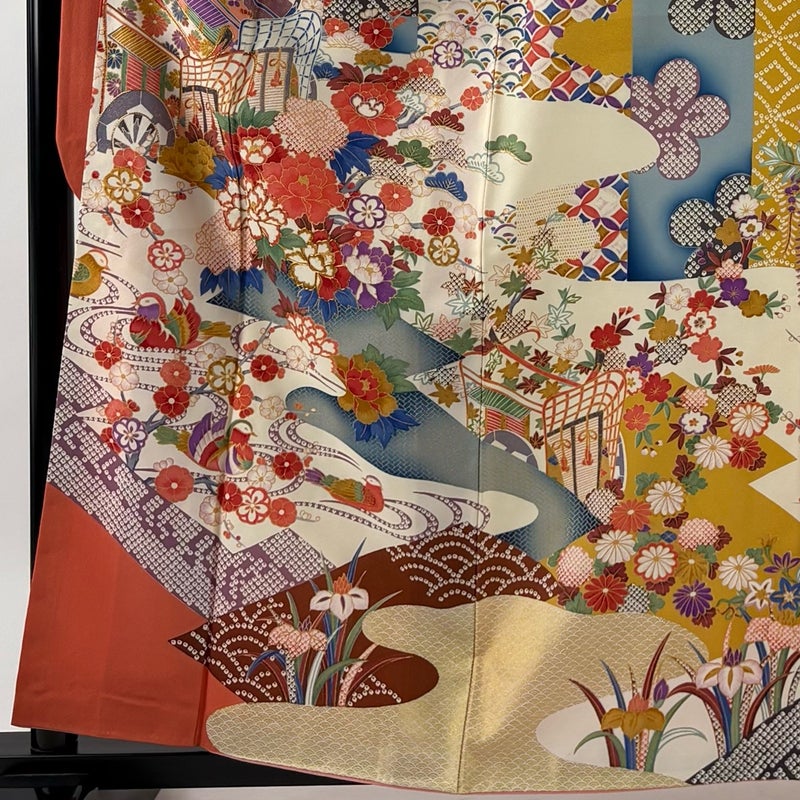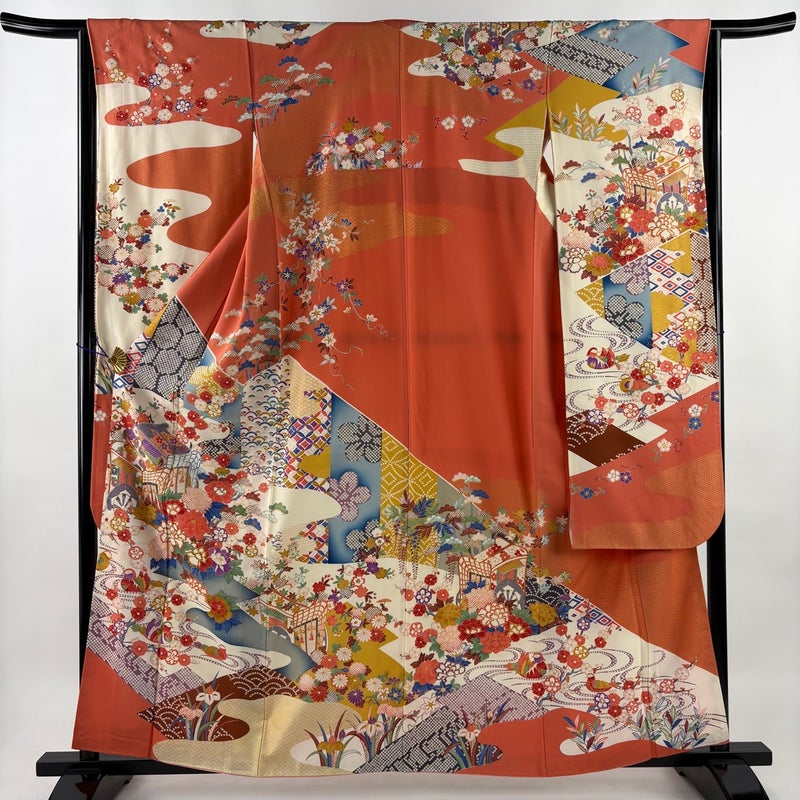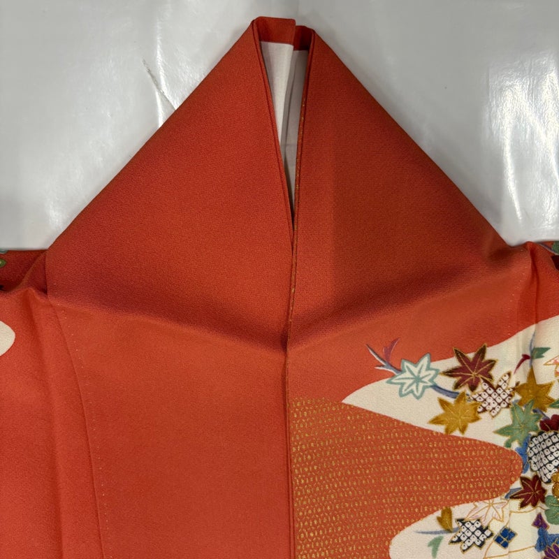 【振袖】 赤系 オレンジ 秀品 B 約150cm~約159cm 裄丈63cm-64cm (S)size 袖丈91cm以上 7990-9980 二万以下