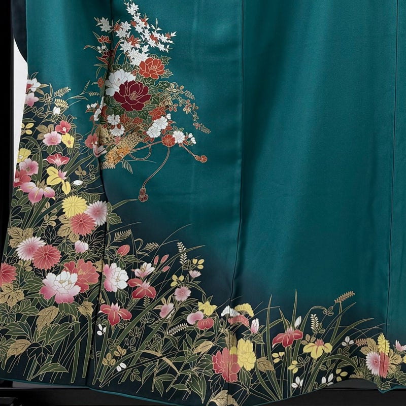 【振袖】 青系 青緑 秀品 B 約150cm~約159cm 裄丈65cm (M)size 袖丈91cm以上 7990-9980 二万以下