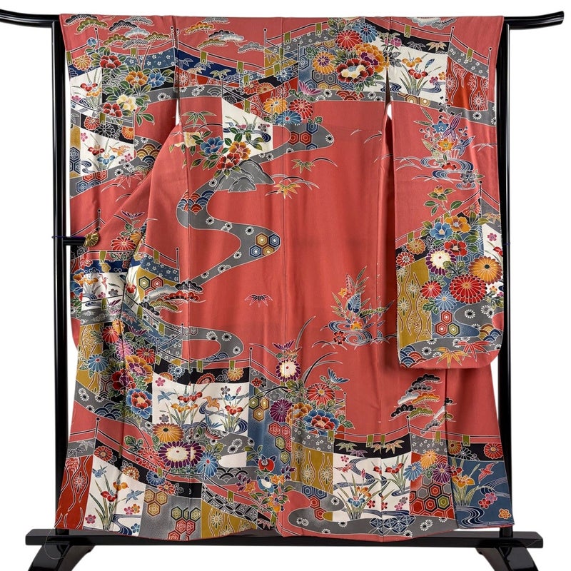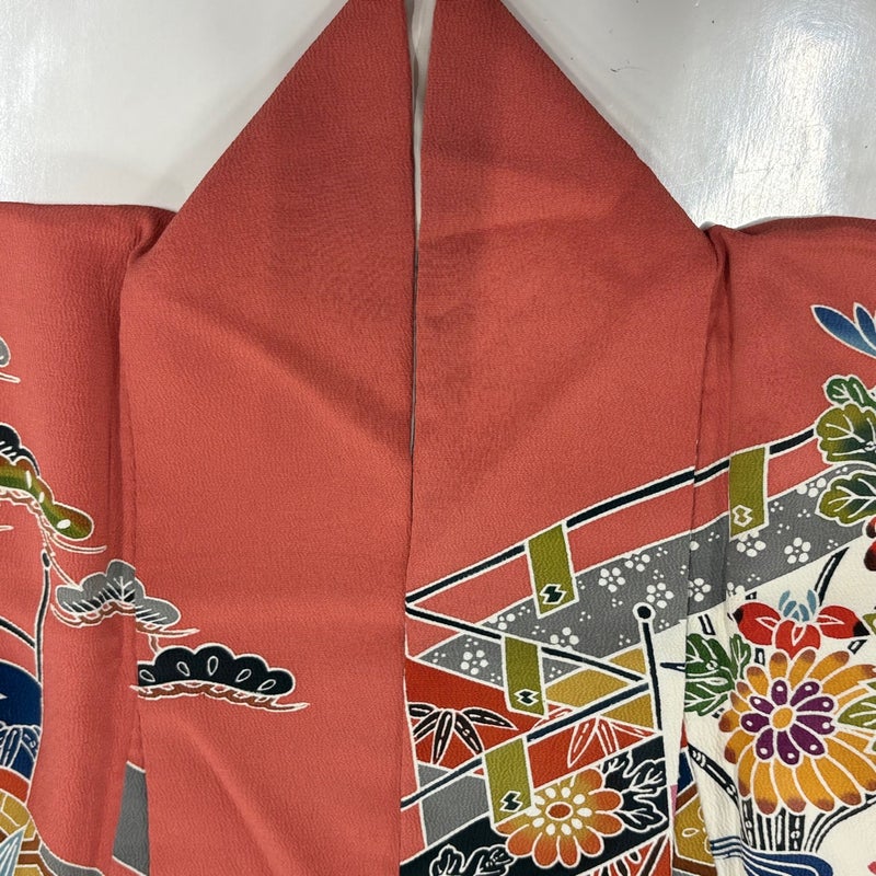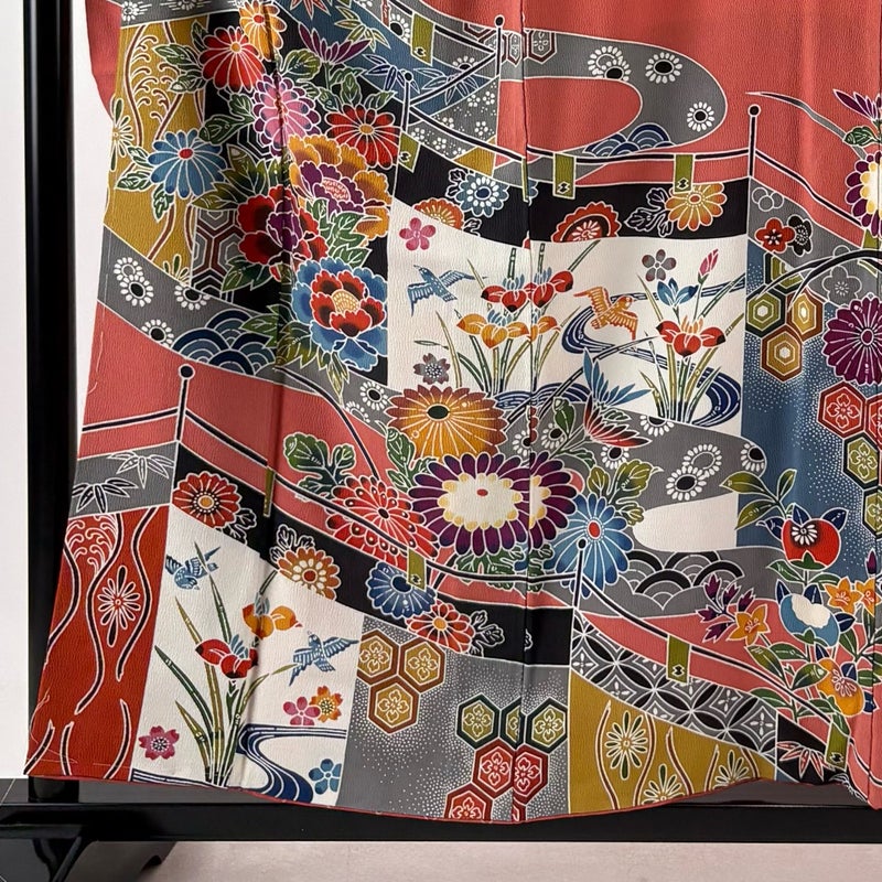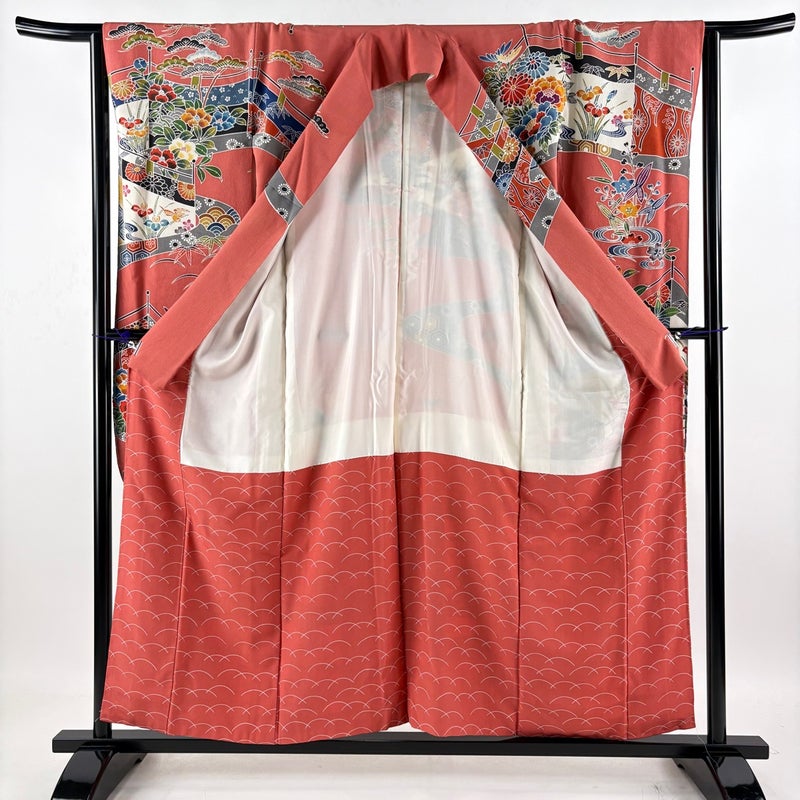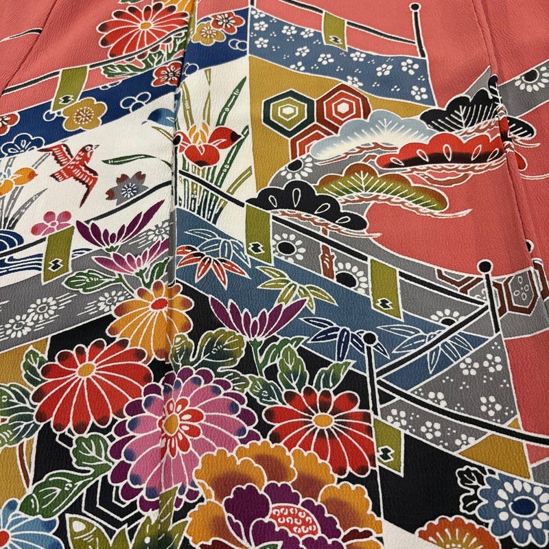 【振袖】 赤系 サーモンピンク 名品 B 約150cm~約159cm 裄丈63cm-64cm (S)size 袖丈91cm以上 9990-29990 二万以下