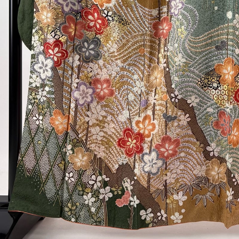 未婚女性の第一礼装としてお使いいただける振袖でございます。 お好みの帯や小物と合わせて晴れの日に相応しい華やかな装いにいかがでしょうか。 ※身丈・裄丈の縫込みの長さは測っておりません。 衿周りに汚れ、両袖口中に薄汚れ、右胸にシワ、表地所々に金彩の剥がれ、後身頃に染めむらがございます。 胴裏にシミ、八掛所々に金銀彩の剥がれがございます。 リユース品としては良い状態で、まだまだご活用頂けると思われます。 ※なお、厳しく商品の状態確認を行っておりますが、記載の汚れ以外にも見落とし箇所がある可能性がある旨ご了承いただけますと幸いです。 沢山の商品の中からご覧いただき誠にありがとうございます。