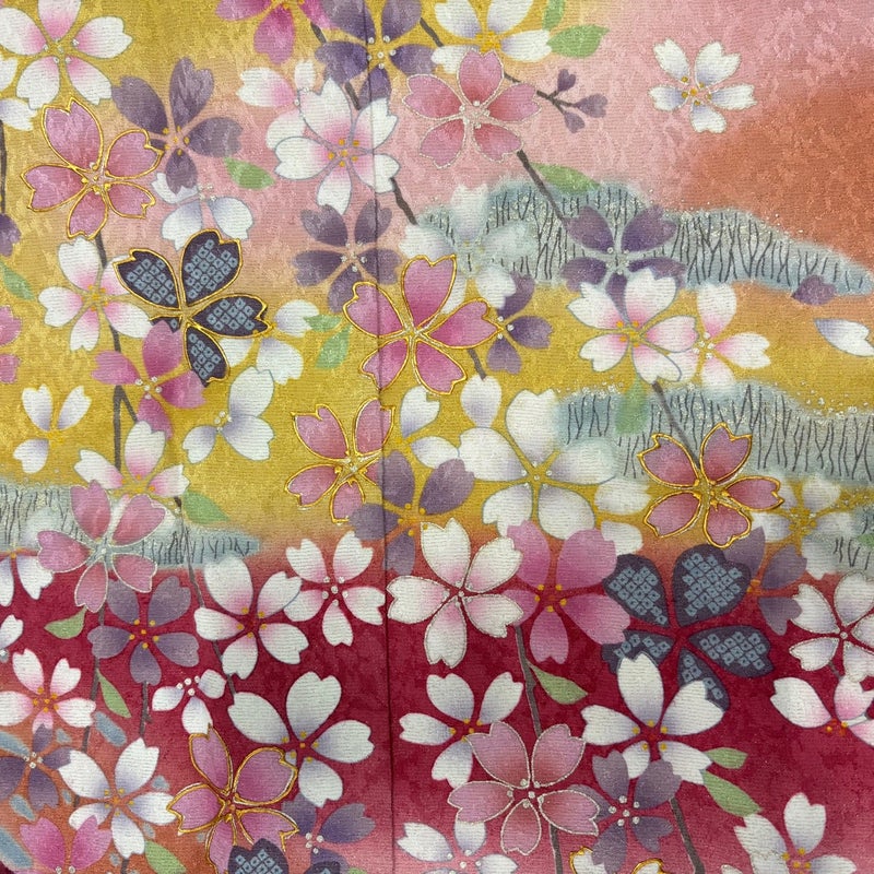【着物ランク】逸品 【素材】正絹 【身丈】約168cm 【裄丈】約69cm 【袖丈】約113cm 【袖幅】約36cm 【前幅】約22.5cm 【後幅】約28.5cm 【サイズ】L 【着物仕立て】袷 【着用時期】10~5月 【状態ランク】ランクB 【着物着用シーン】成人式、謝恩会