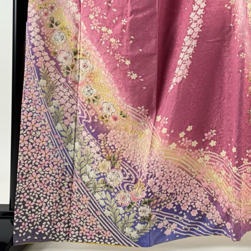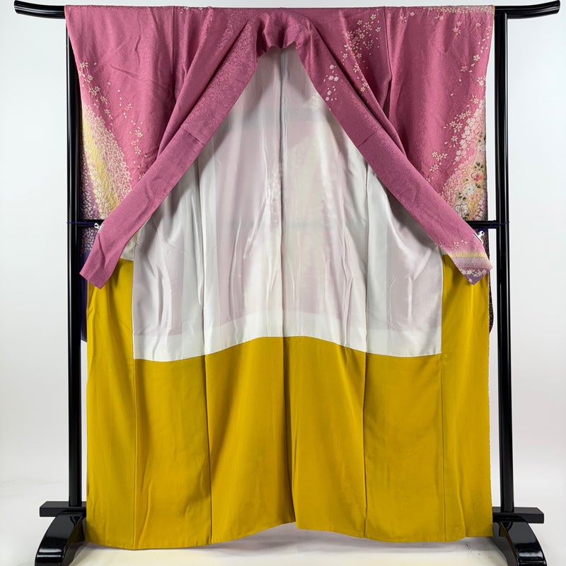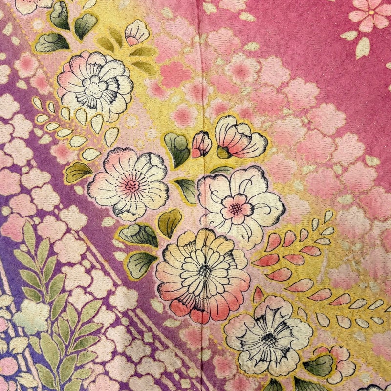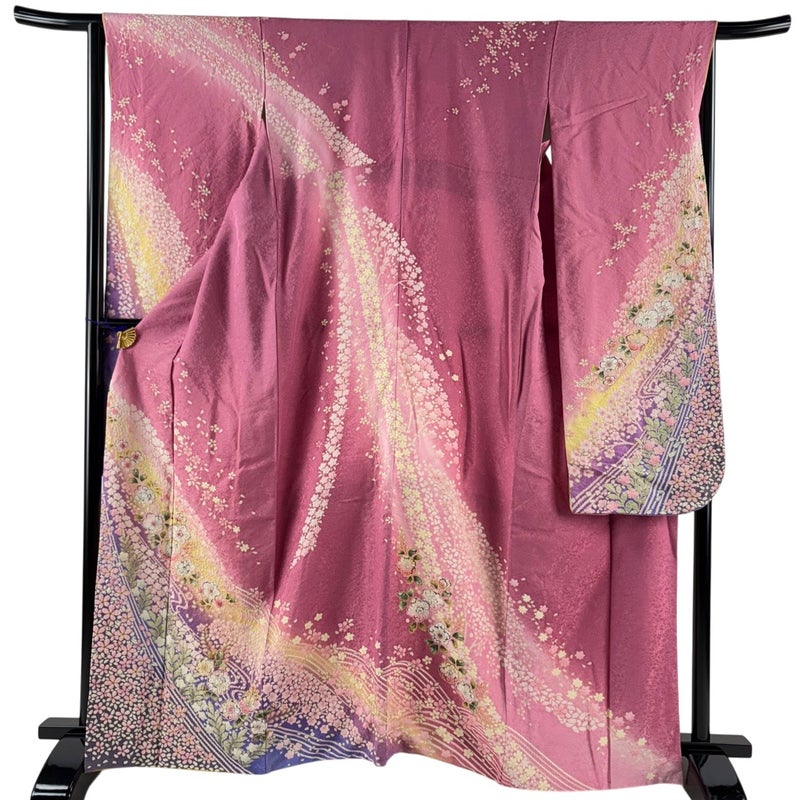 【着物ランク】逸品 【素材】正絹 【身丈】約164cm 【裄丈】約66cm 【袖丈】約108.5cm 【袖幅】約33cm 【前幅】約23.5cm 【後幅】約29.5cm 【サイズ】M 【着物仕立て】袷 【着用時期】10~5月 【状態ランク】ランクB 【着物着用シーン】成人式、謝恩会