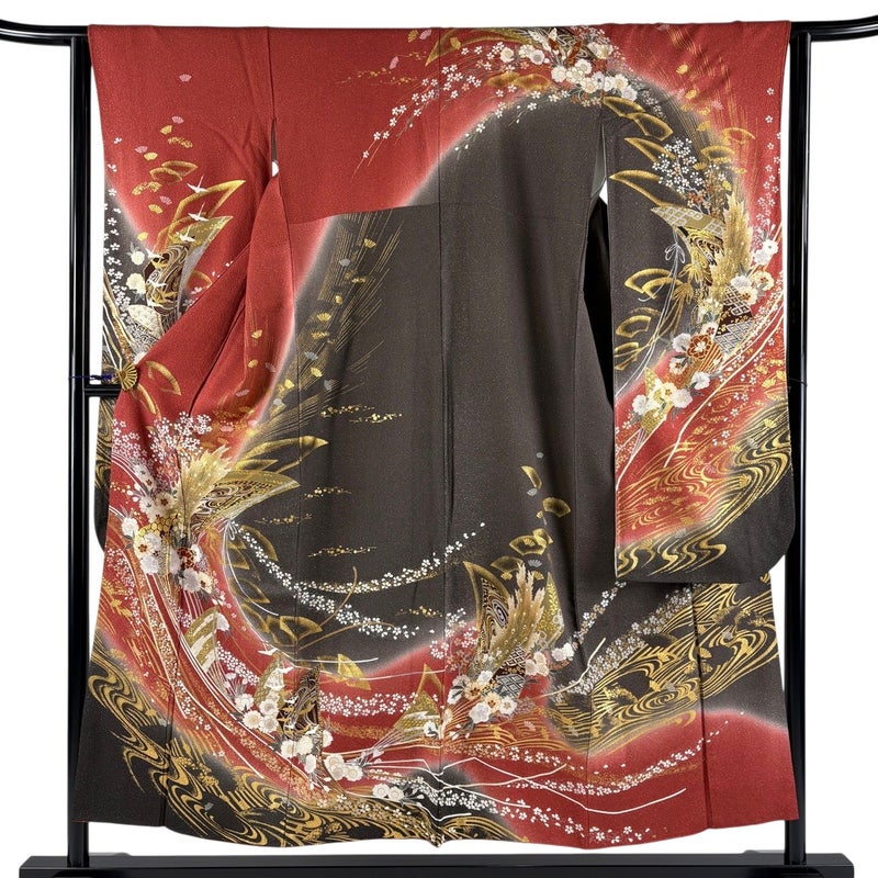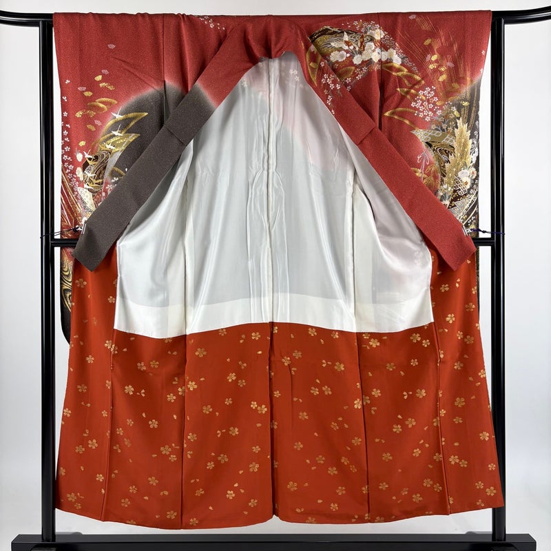 【振袖】 赤系 茜色 秀品 B 約150cm~約159cm 裄丈63cm-64cm (S)size 袖丈91cm以上 7990-9980 二万以下