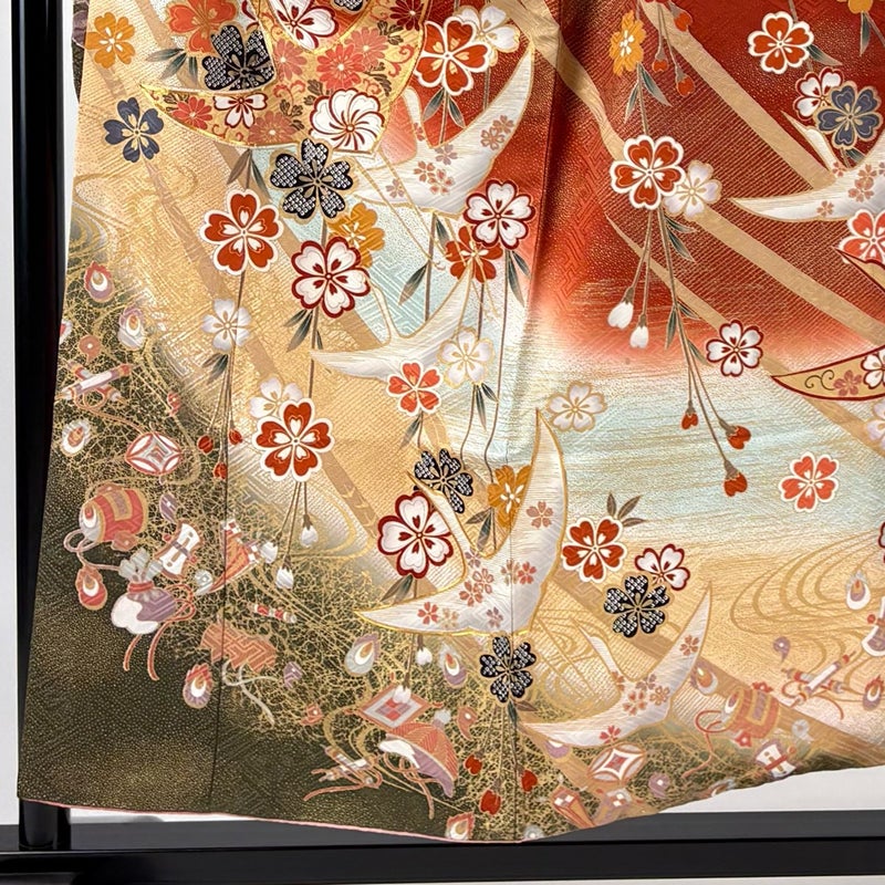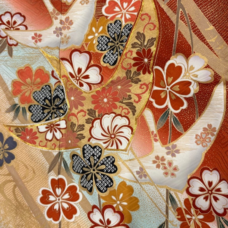 【着物ランク】秀品 【素材】正絹 【身丈】約156cm 【裄丈】約65cm 【袖丈】約103.5cm 【袖幅】約33.5cm 【前幅】約24cm 【後幅】約29.5cm 【サイズ】M 【着物仕立て】袷 【着用時期】10~5月 【状態ランク】ランクB 【着物着用シーン】成人式、謝恩会