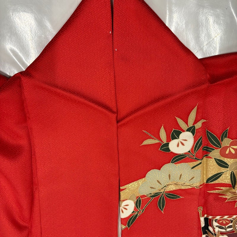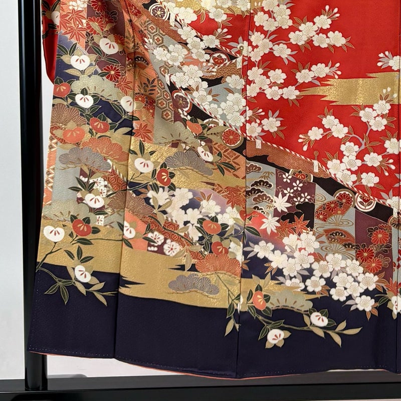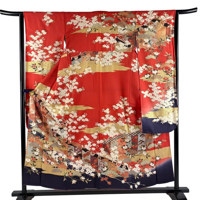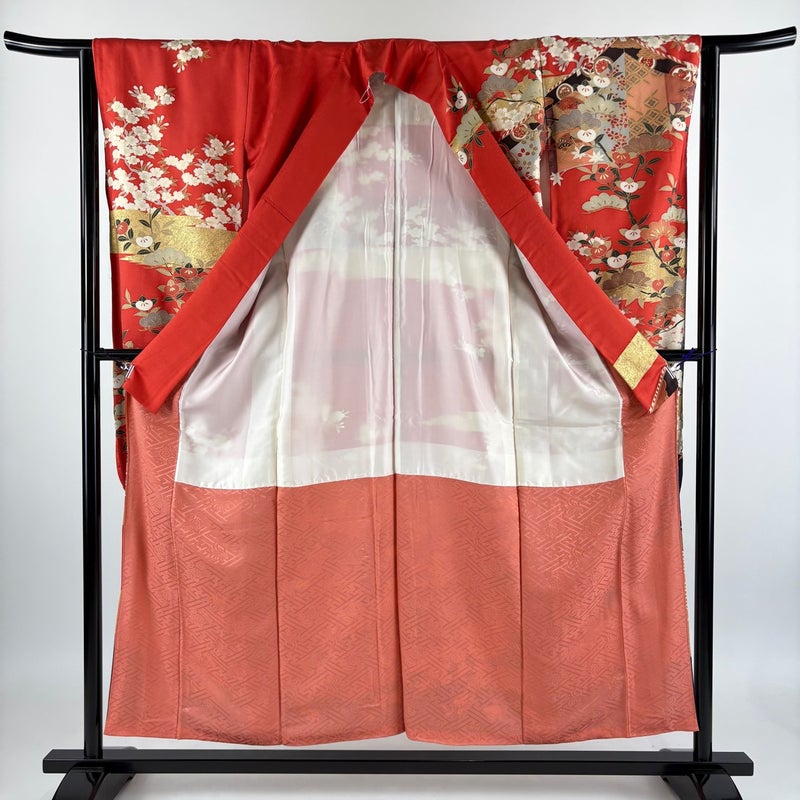 【振袖】 赤系 朱色 秀品 B 約150cm~約159cm 裄丈63cm-64cm (S)size 袖丈91cm以上 7990-9980 二万以下
