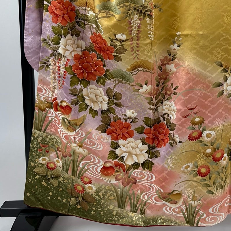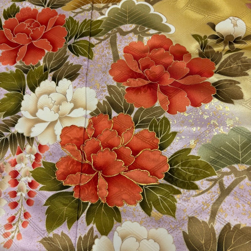 【着物ランク】秀品 【素材】正絹 【身丈】約158.5cm 【裄丈】約67cm 【袖丈】約112cm 【袖幅】約34cm 【前幅】約25cm 【後幅】約31cm 【サイズ】M 【着物仕立て】袷 【着用時期】10~5月 【状態ランク】ランクB 【着物着用シーン】成人式、謝恩会