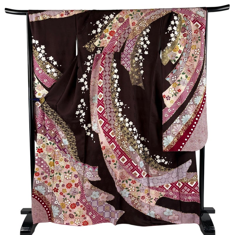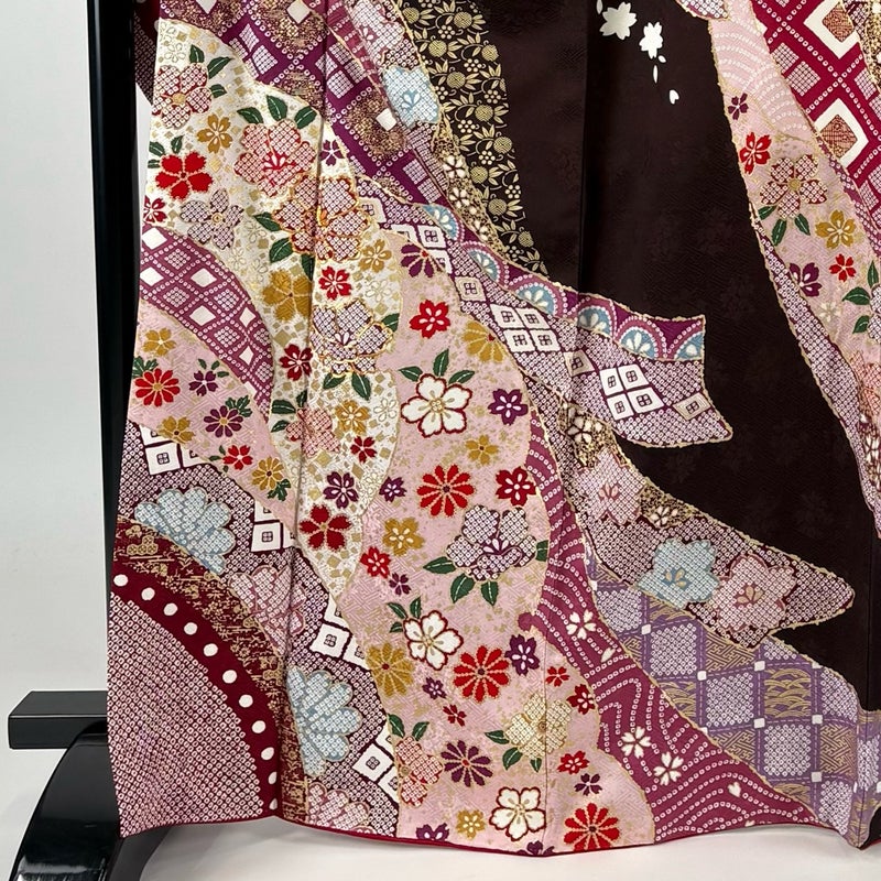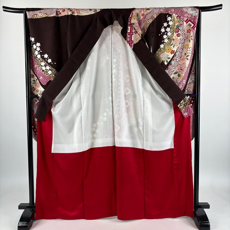 【振袖】 茶系 焦茶色 秀品 A 約160cm~約169cm 裄丈67cm-68cm (L)size 袖丈91cm以上 9990-29990 美品 二万以下