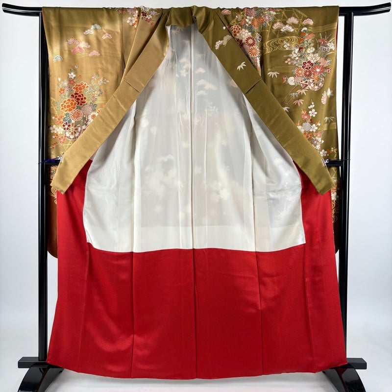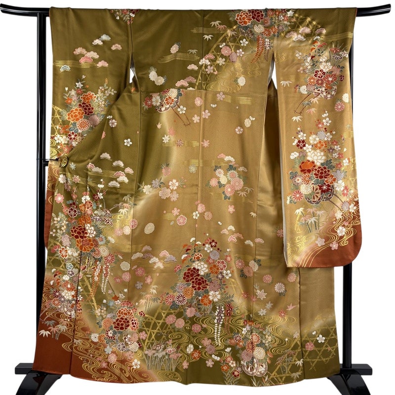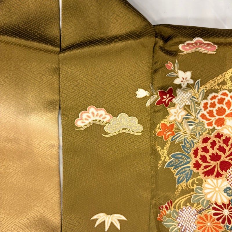 【振袖】 黄色系 薄黄土色 秀品 B 約160cm~約169cm 裄丈65cm (M)size 袖丈91cm以上 7990-9980 二万以下